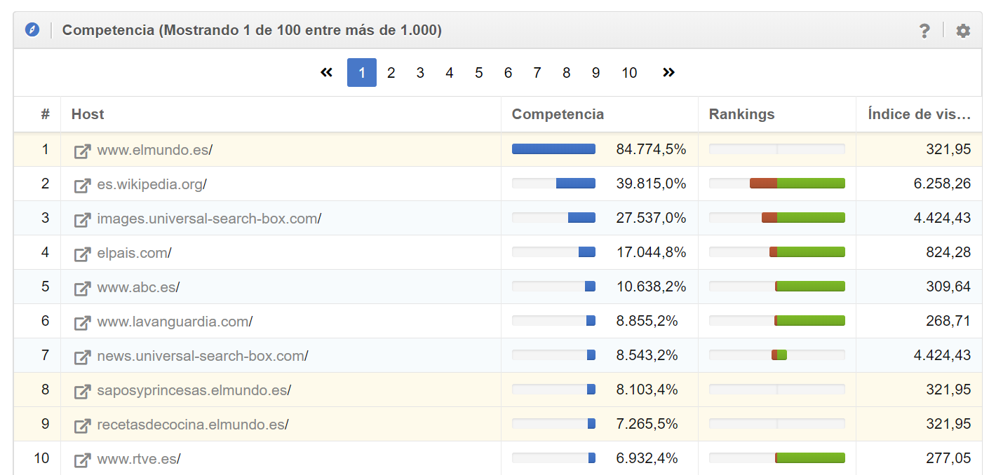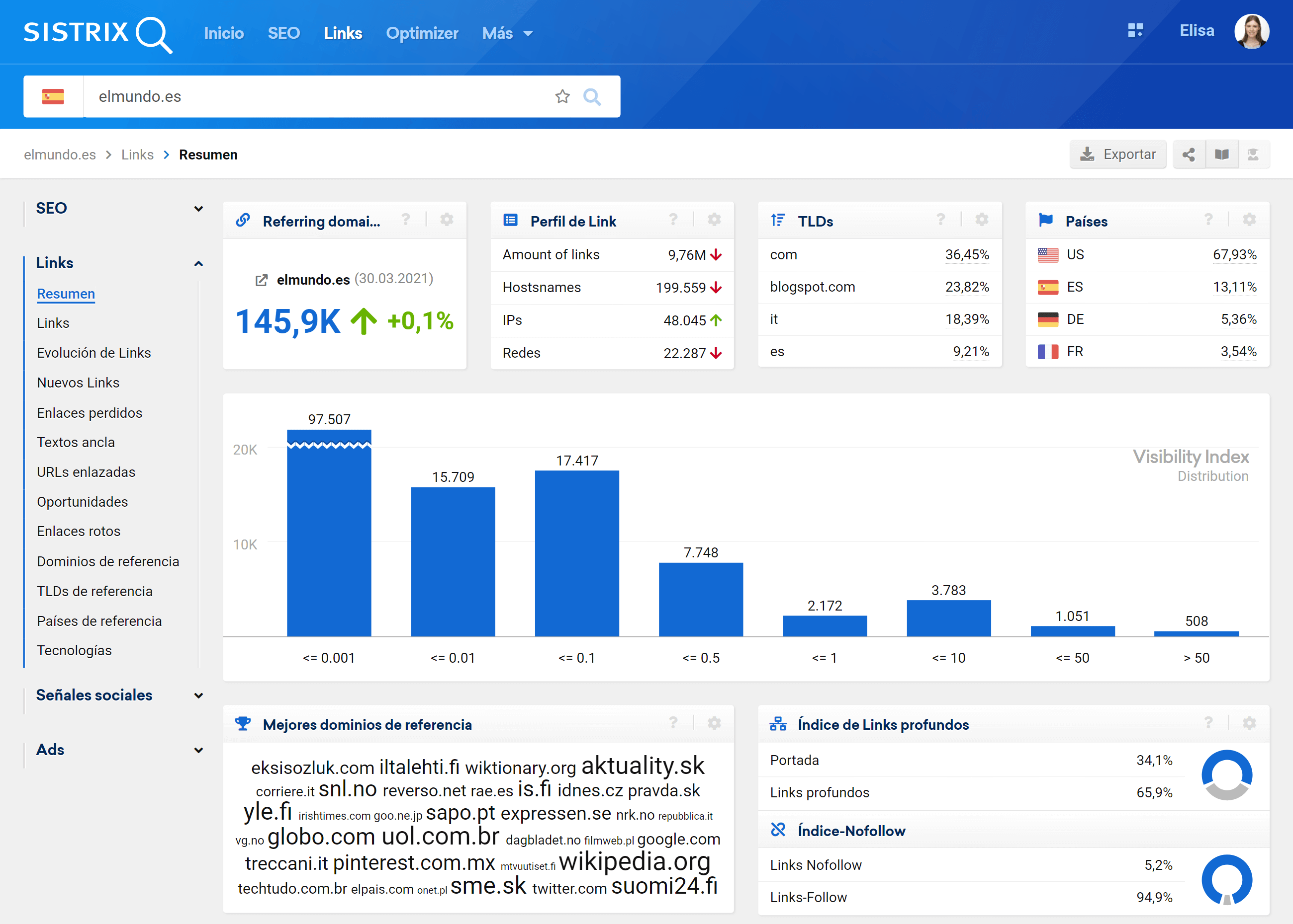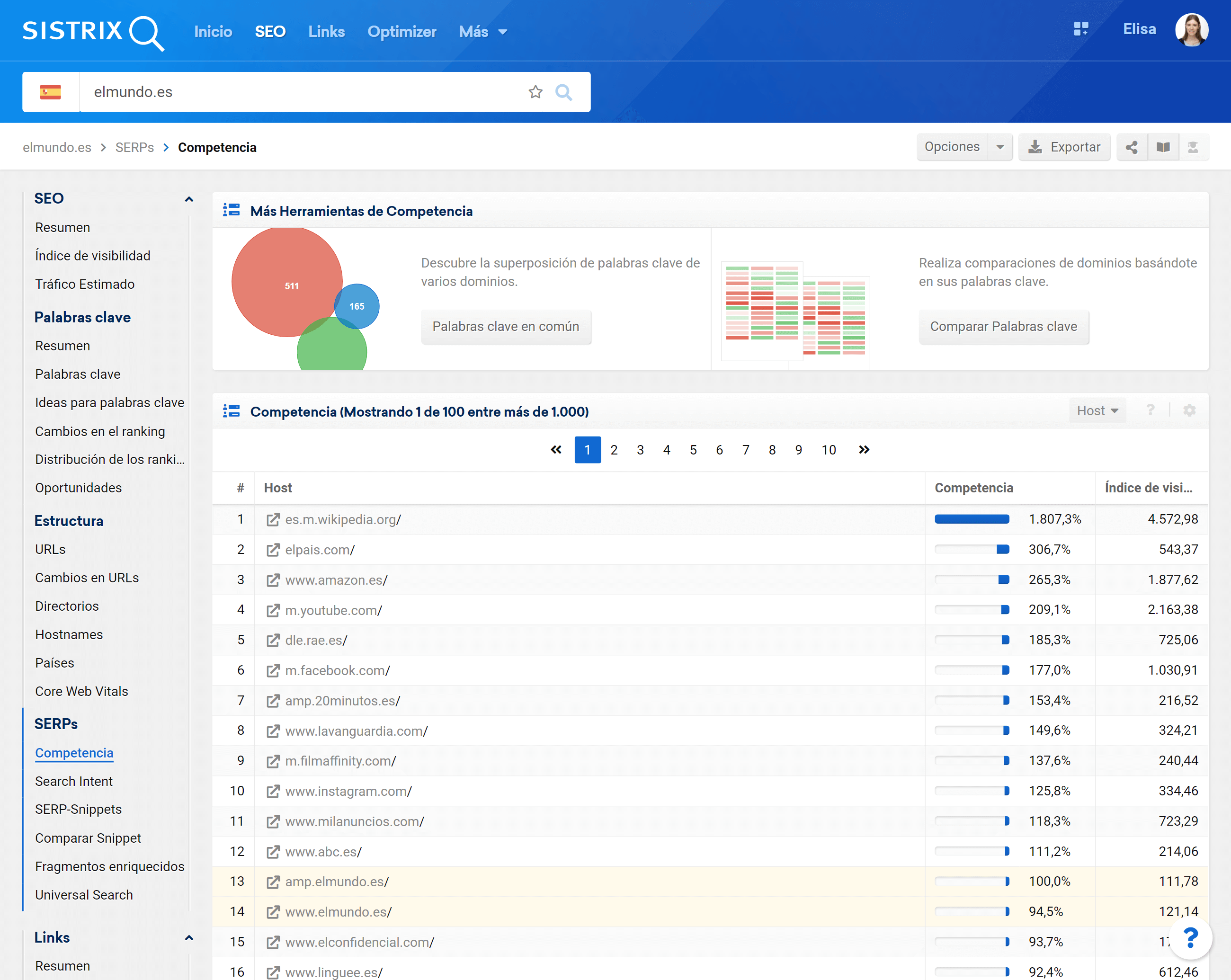 Si con tu sitio web ya estás posicionando, puedes usar la función competencia de SISTRIX para buscar sitios que tengan palabras clave que estén compitiendo con las tuyas. Cuanto mayor sea su visibilidad, más interesante será un examen del perfil de enlaces de estas páginas. Y si los resultados de posicionamiento de estos dominios son mejores, es porque son relevantes en términos de contenido y tienen enlaces excelentes.
