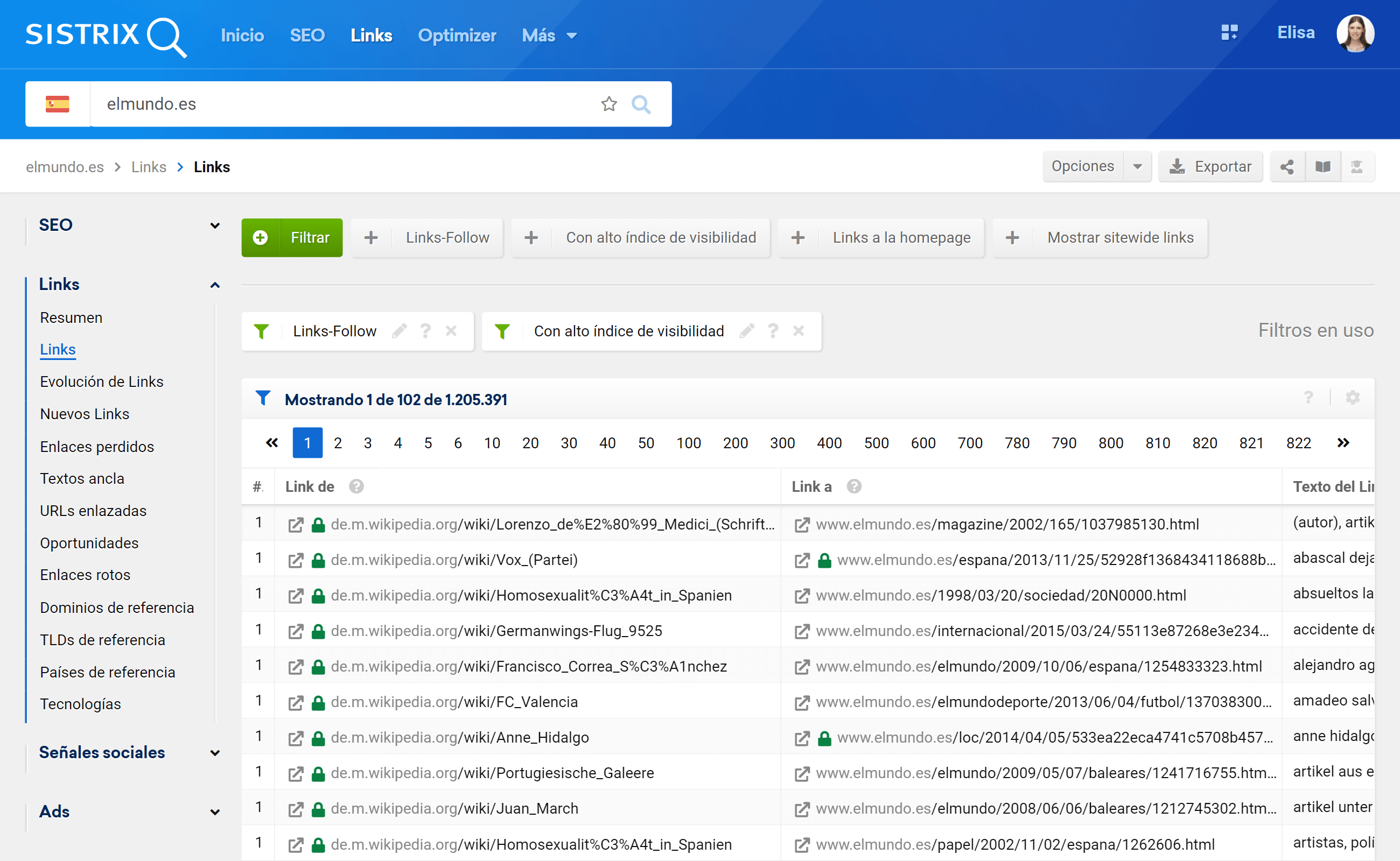 Como puedes ver muchas rutas dentro de la herramienta te guían a la vista general de los enlaces individuales. Utiliza los filtros disponibles, ya que te ayudarán a descubrir muchos enlaces relevantes. Para inspirarte: filtra dominios,