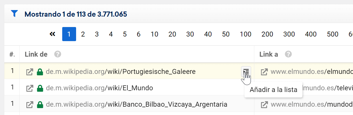 Al hacer clic en el signo «+» que se muestra al final de cada URL en la imagen de arriba en 3, accederás directamente al análisis de esta: se mostrarán únicamente los enlaces que apuntan a la URL en cuestión.
