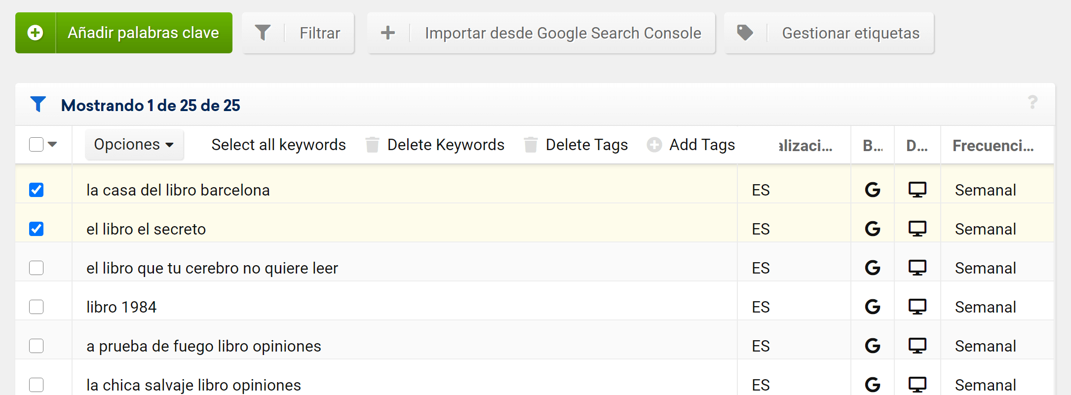 - Con la ayuda de las etiquetas, puedes agrupar tus palabras clave y evaluarlas según ciertos criterios. Por ejemplo, según una restricción temática, o si estás rastreando palabras clave para diferentes ciudades.
