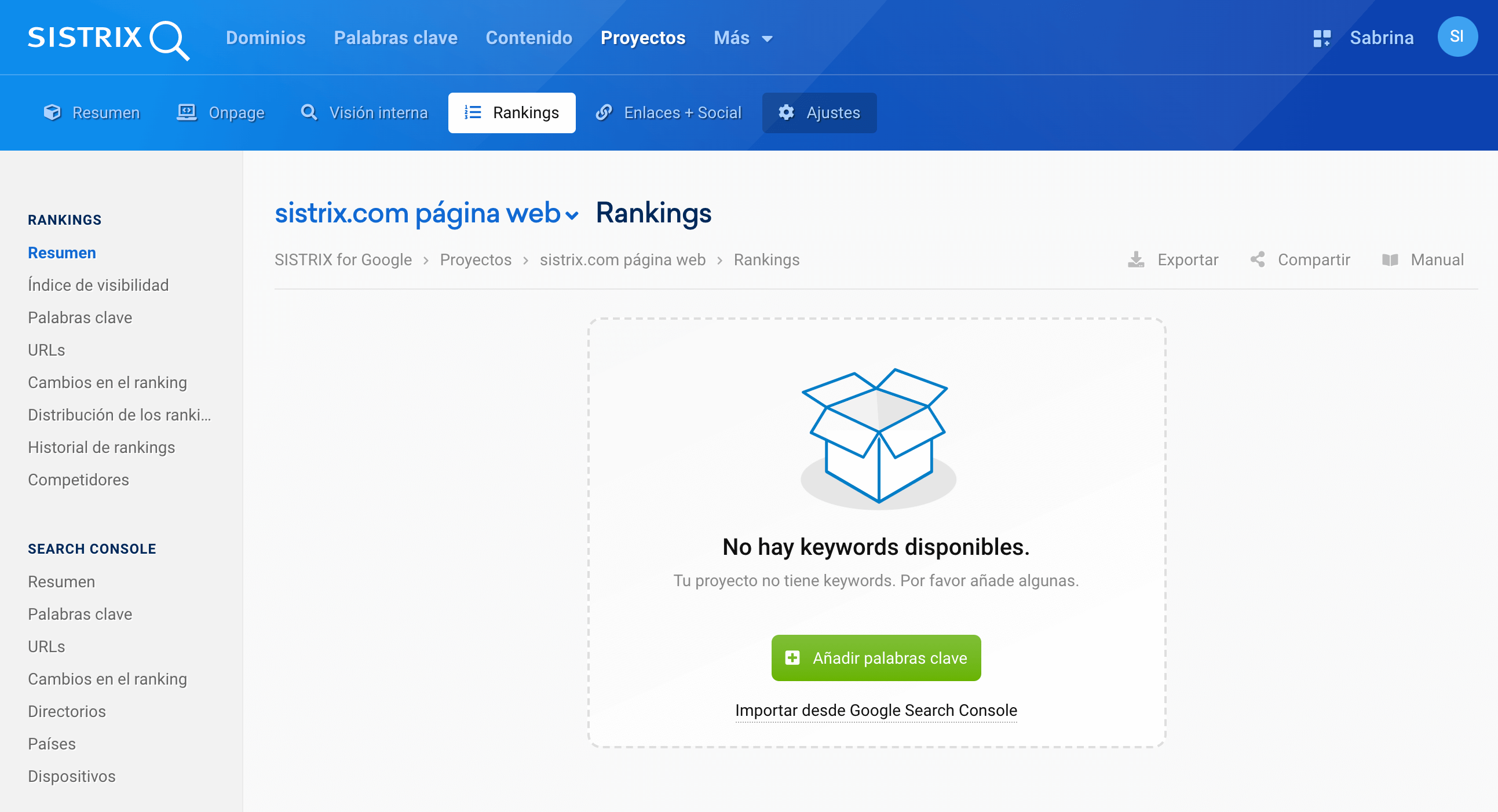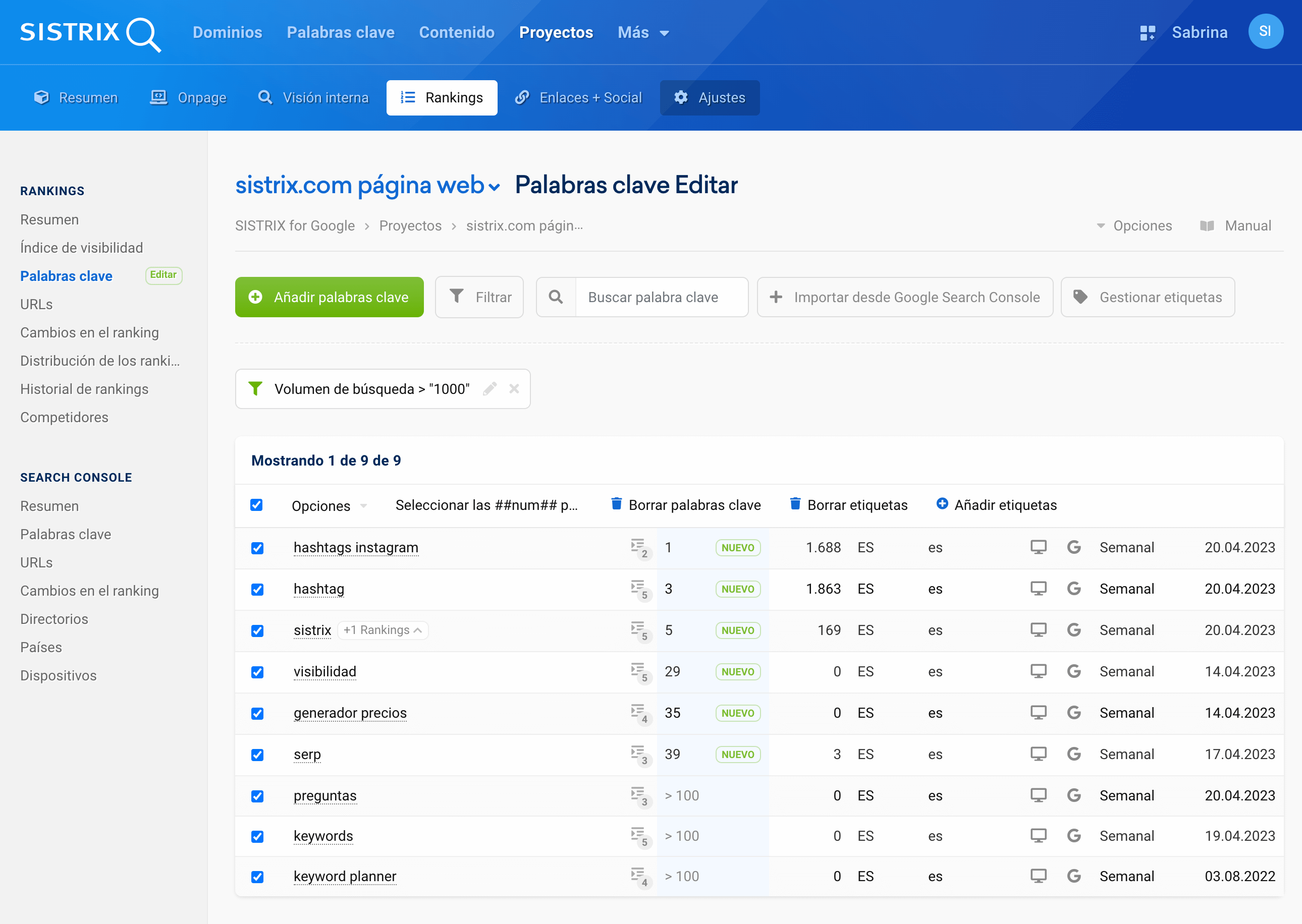 - Haz un seguimiento de las palabras clave que SISTRIX aún no conoce (por ejemplo, para temas específicos o de nichos).