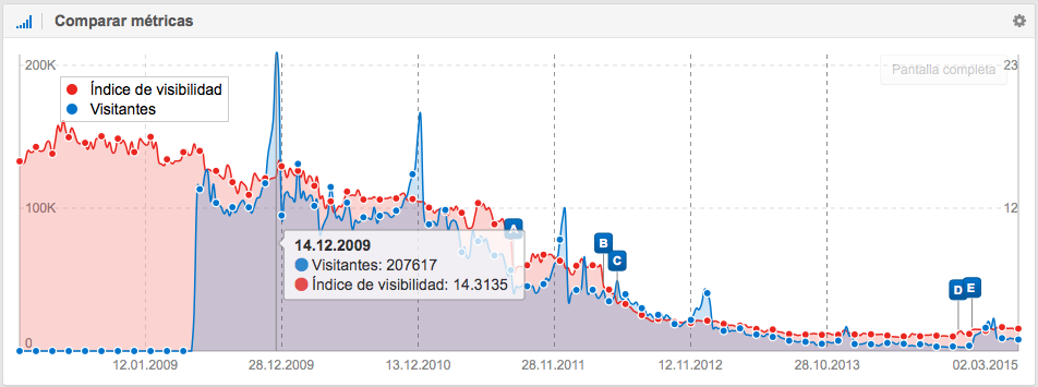 Durante tu propio análisis notarás, de todos modos, correlaciones entre ambos valores. El siguiente gráfico muestra la comparación entre visibilidad y visitantes. Las métricas son casi paralelas: