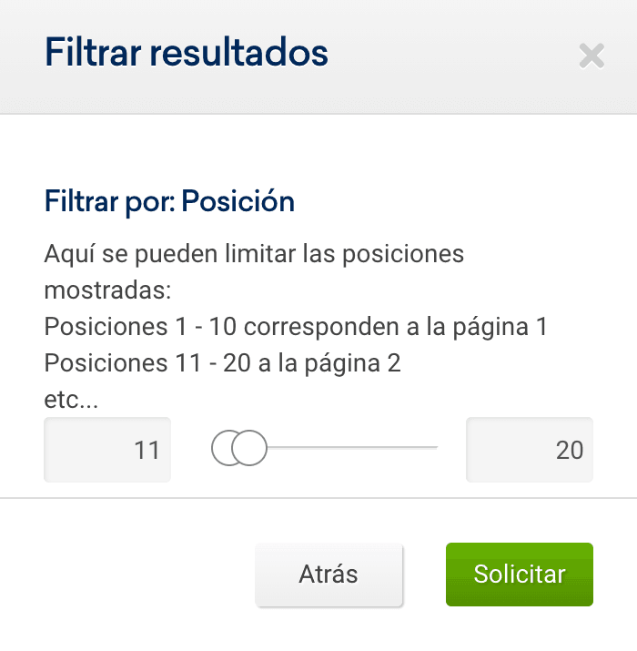 Con el filtro de posición, puedes ver solamente las palabras clave que se encuentran en determinadas posiciones del ranking. Con la ayuda de este filtro puedes, por ejemplo, identificar las «low hanging fruits».