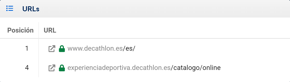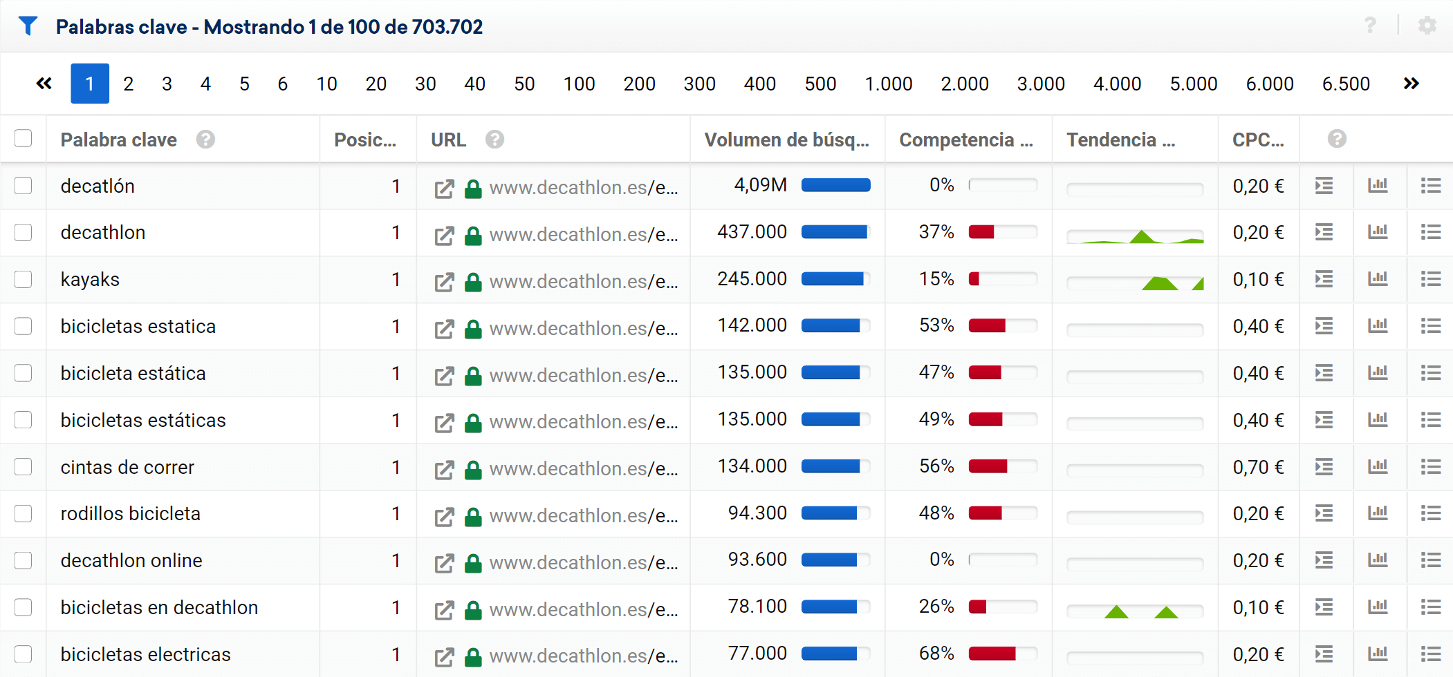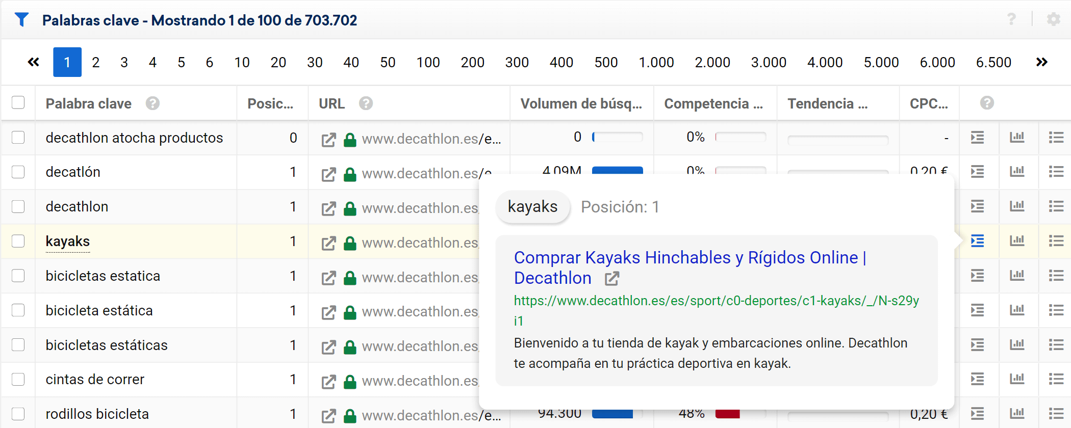 En la última columna encontrarás la URL del dominio que se clasifica para esta palabra clave en la posición indicada. Puedes hacer clic también en la URL para analizarla con más detalle.