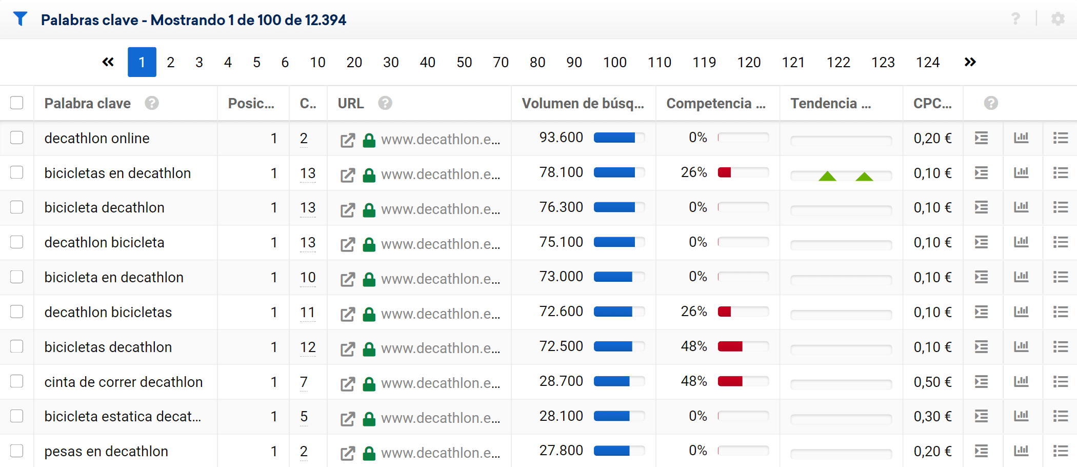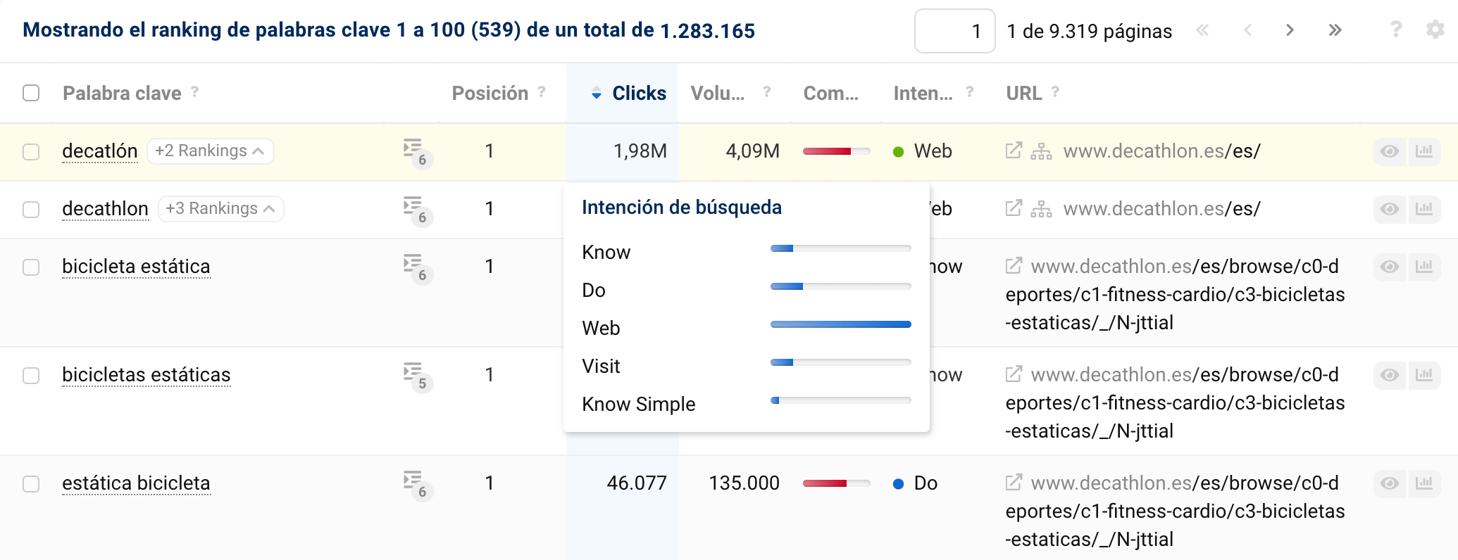 Por ejemplo, mueve el ratón sobre la intención «web» de la palabra clave «decatlón» 1 y verás la relativa distribución.