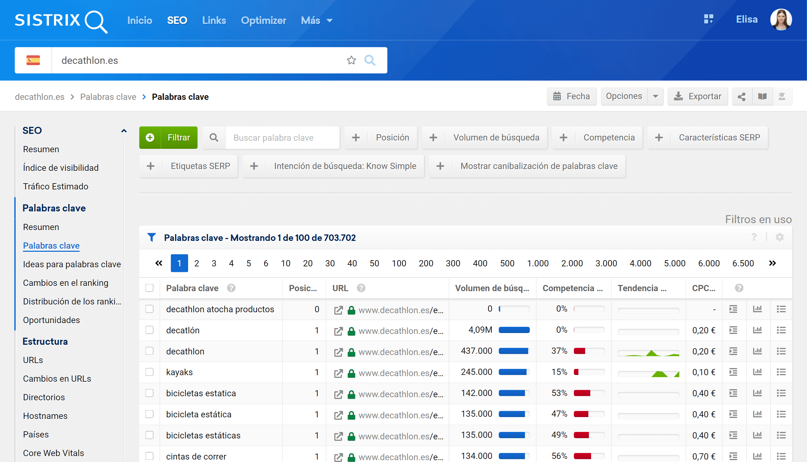 Para analizar con mayor precisión los datos de las palabras clave de un dominio, SISTRIX te ofrece una serie de filtros predefinidos, así como la posibilidad de crear filtros individuales según tus necesidades.