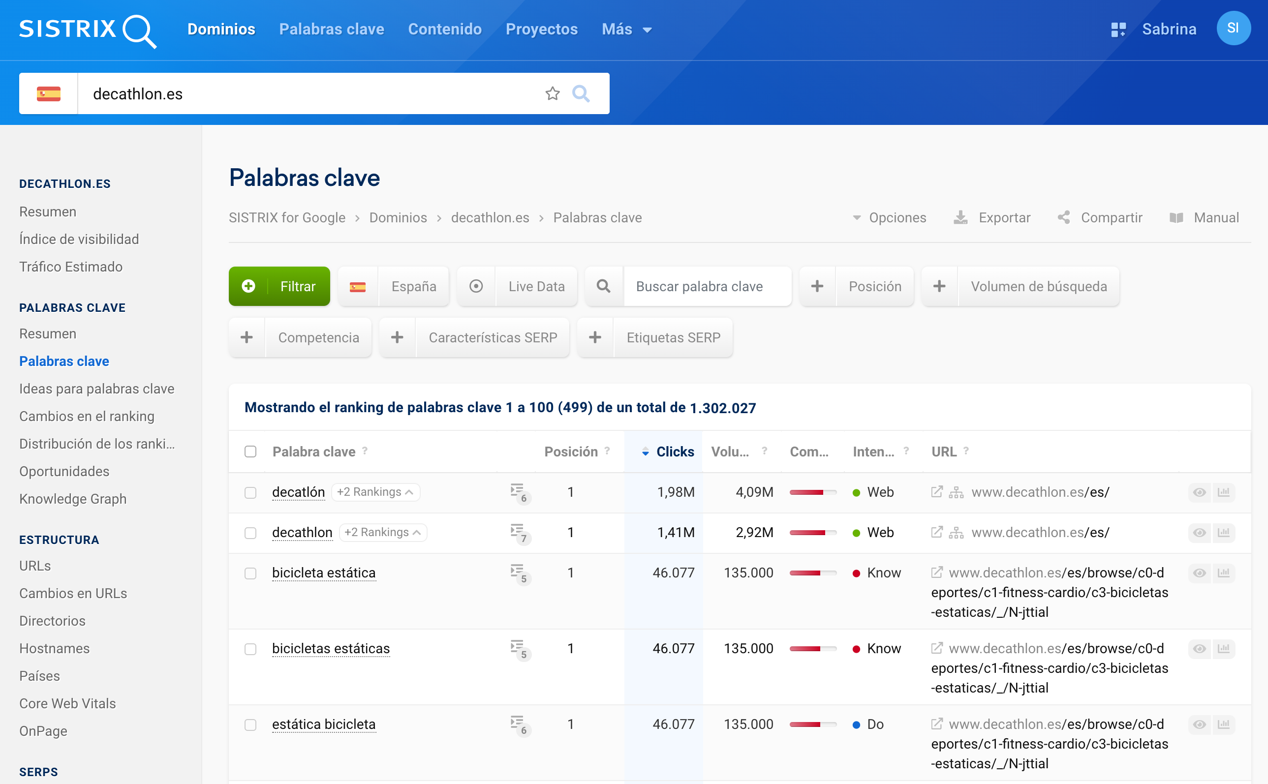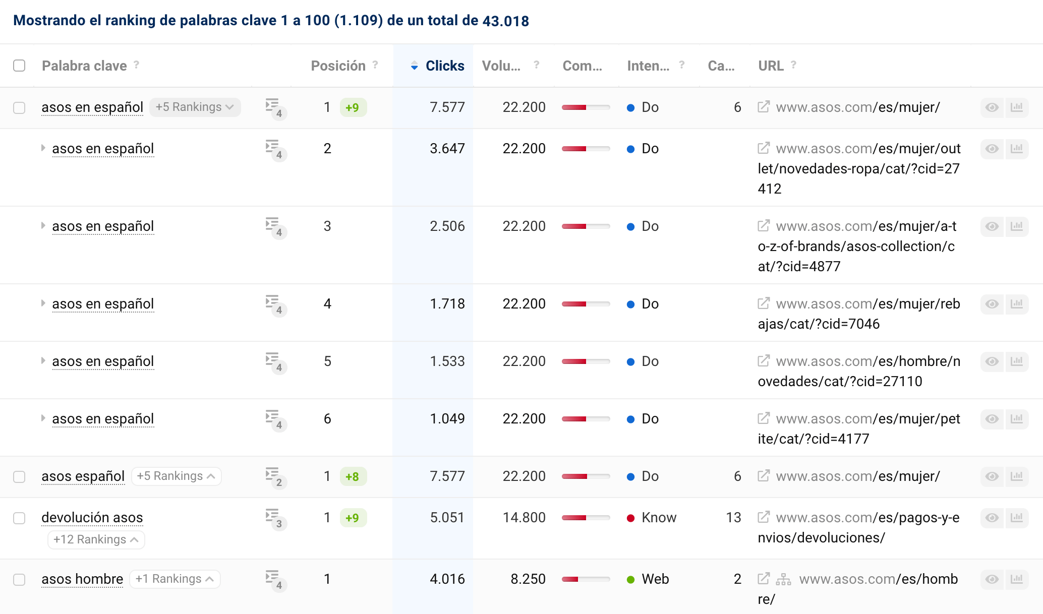 La columna de la derecha muestra el número de clics generados por el dominio a través de esta palabra clave. Esto se debe a que dependiendo de la intención de búsqueda y, por tanto, de la disposición de las SERP la elección de los resultados orgánicos en los que hacen clic los buscadores varía.
