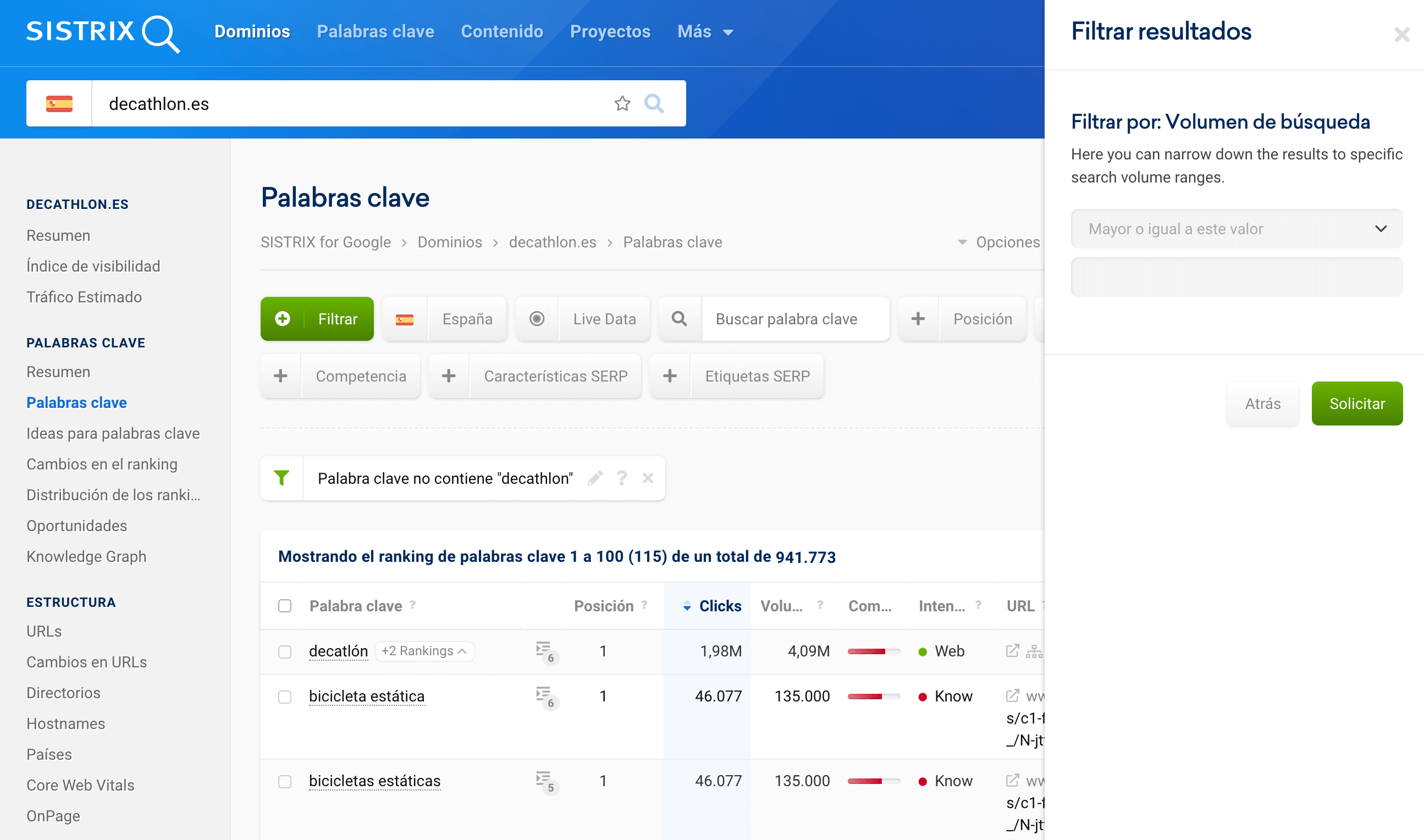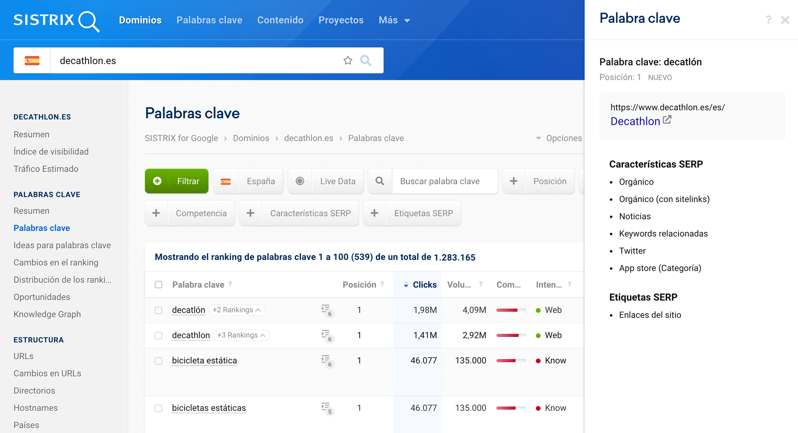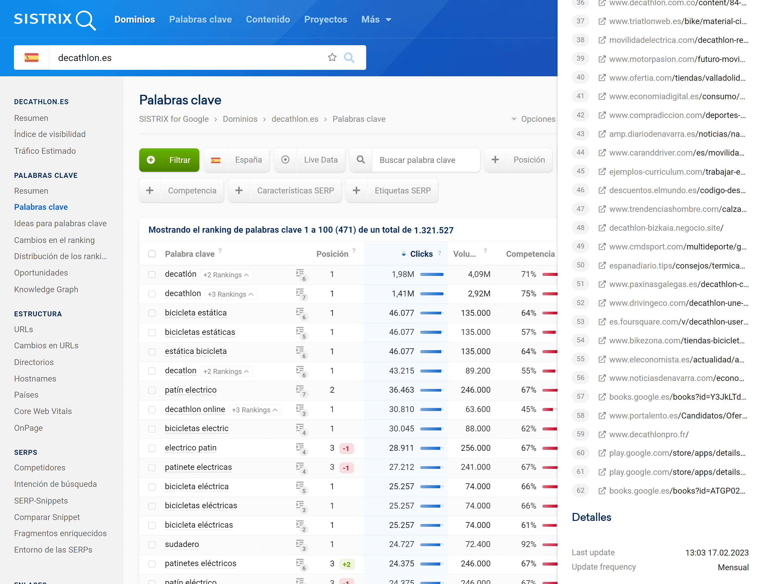 En otro artículo encontrarás toda la información sobre qué países y cuántas palabras clave cubre SISTRIX.