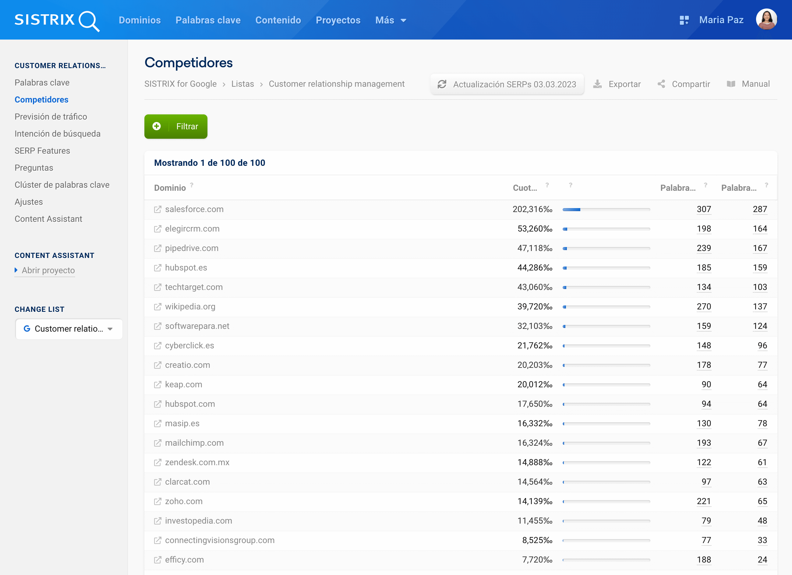 Una vez actualizados los datos SERPs, encontrarás la información sobre tus competidores en el menú a la izquierda de la lista 2.