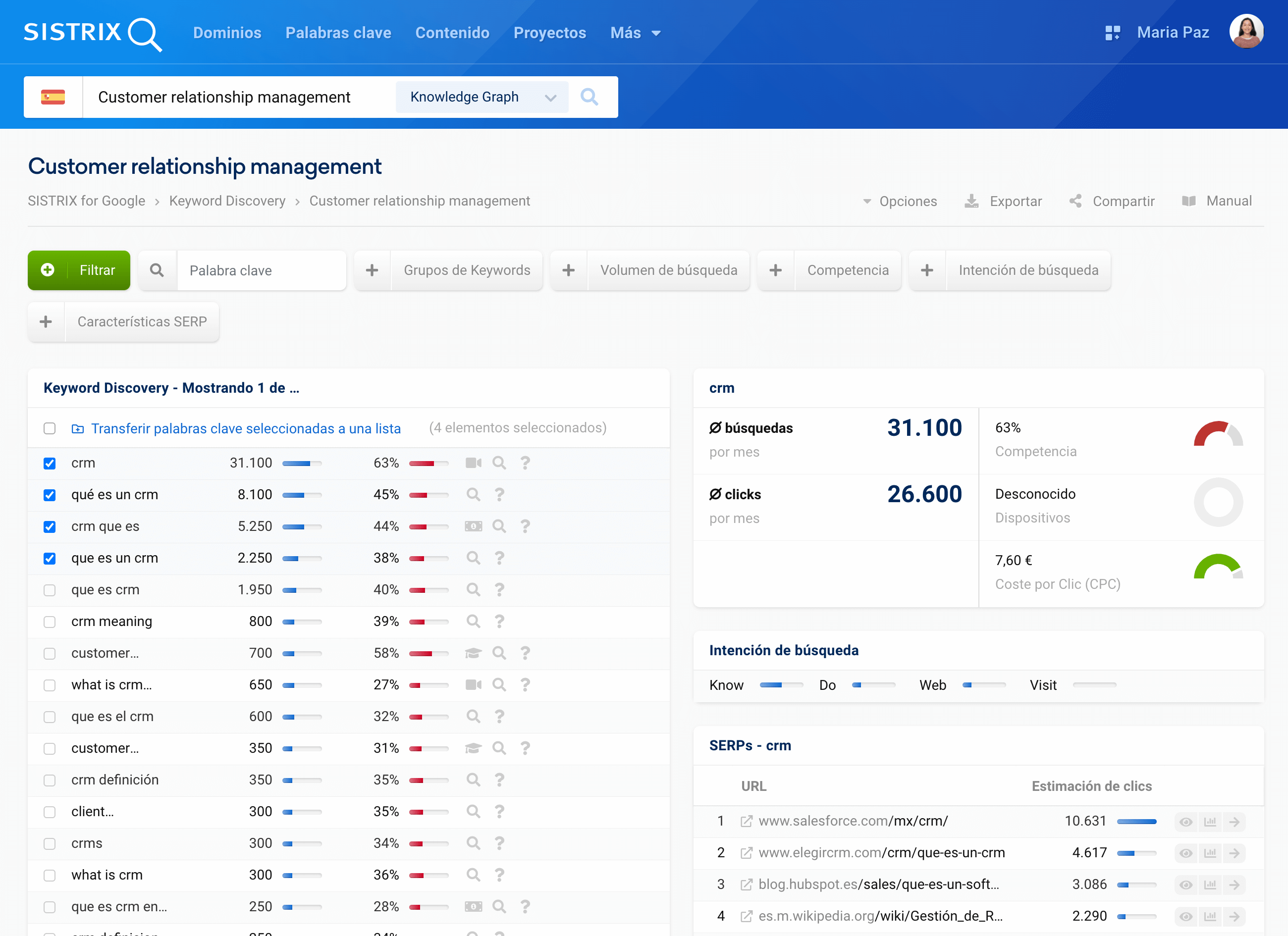 Como primer paso, examina las palabras clave para las que se muestra el Panel de Knowledge Graph para «Customer Relationship Management».