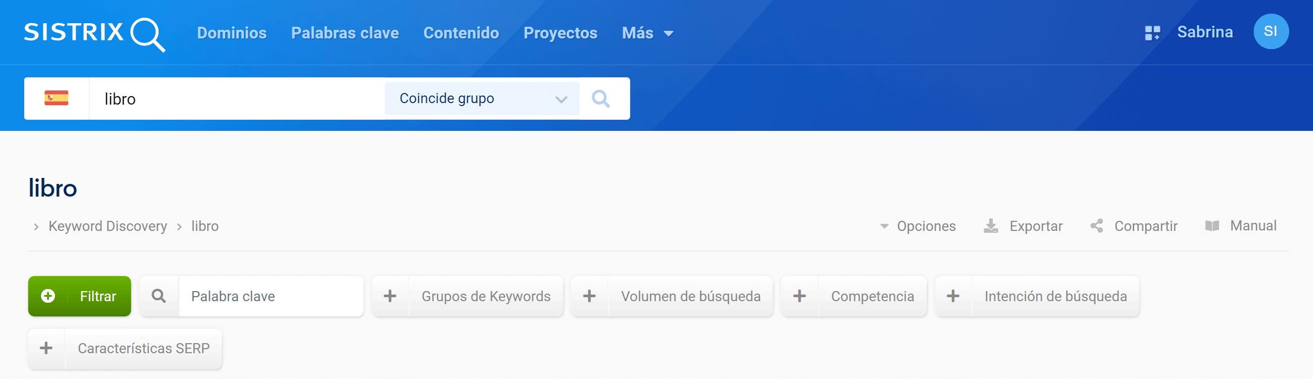 Para nuestra seed keyword «libro«, por ejemplo, se trata de grupos como «gratis», «familia» o «descargar». Estos grupos de palabras clave te ayudan a identificar los temas más importantes y relevantes para tu investigación de palabras clave.