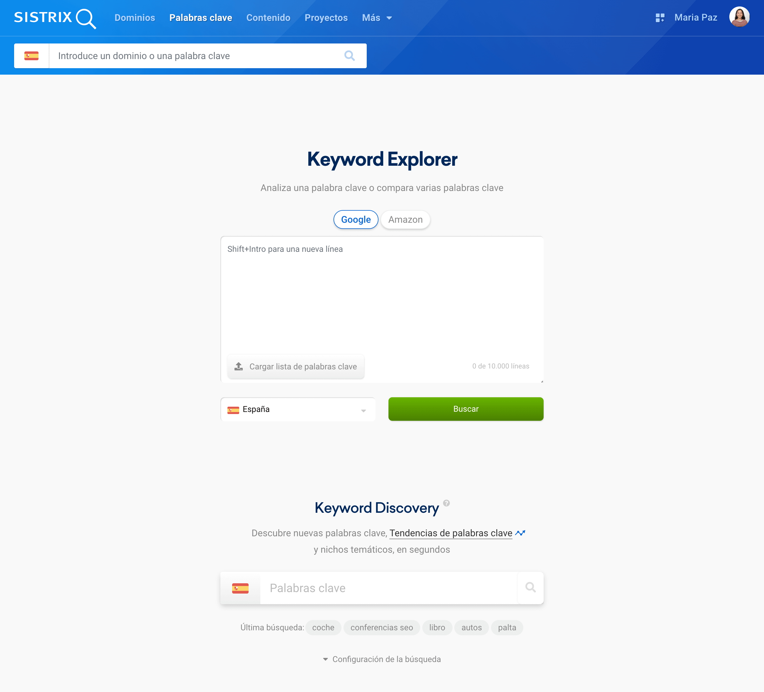 La herramienta de SISTRIX para la investigación de palabras clave es Keyword Discovery. Esta herramienta combina todos nuestros conocimientos de palabras clave bajo una interfaz sencilla. Puedes encontrar nuestro Keyword Discovery haciendo clic en la pestaña «Palabras clave» del menú horizontal superior de la herramienta SISTRIX.