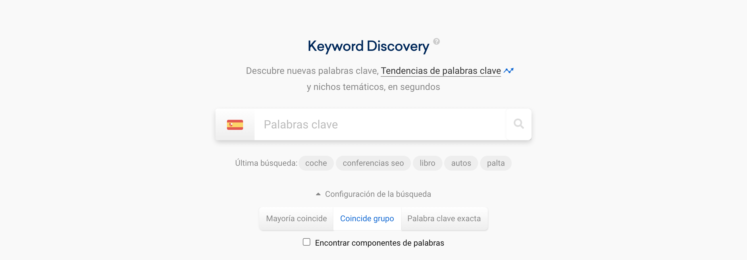En la barra de búsqueda que hay justo debajo de «Keyword Discovery» 1 puedes introducir tus palabras clave semilla o seed keywords, es decir palabras clave que ya encajan en tu proyecto y que te gustaría utilizar para descubrir nuevas palabras clave o tendencias.