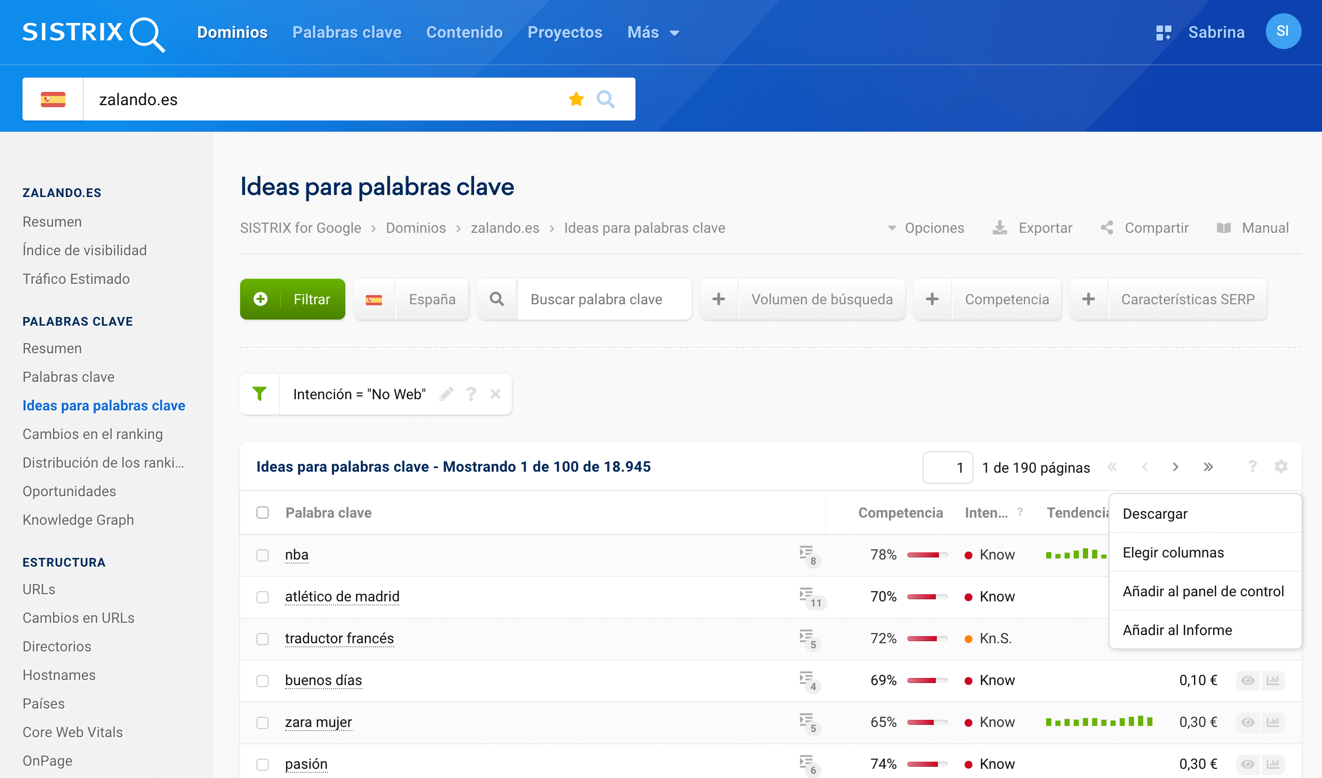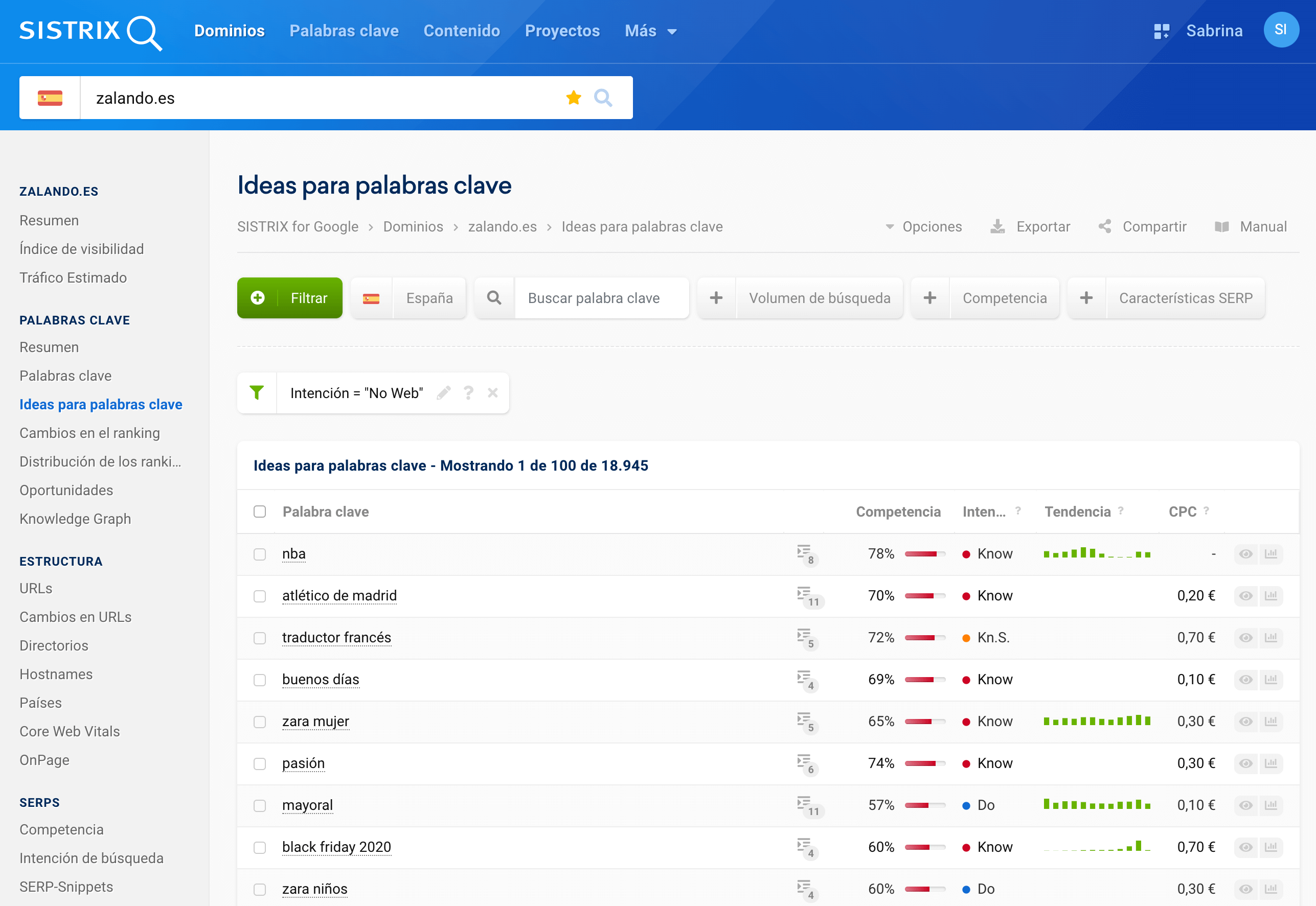 Puedes acceder a las Ideas para palabras clave a través del menú de la parte izquierda de la página 1 una vez que hayas introducido el dominio que deseas analizar en la barra de búsqueda de SISTRIX.
