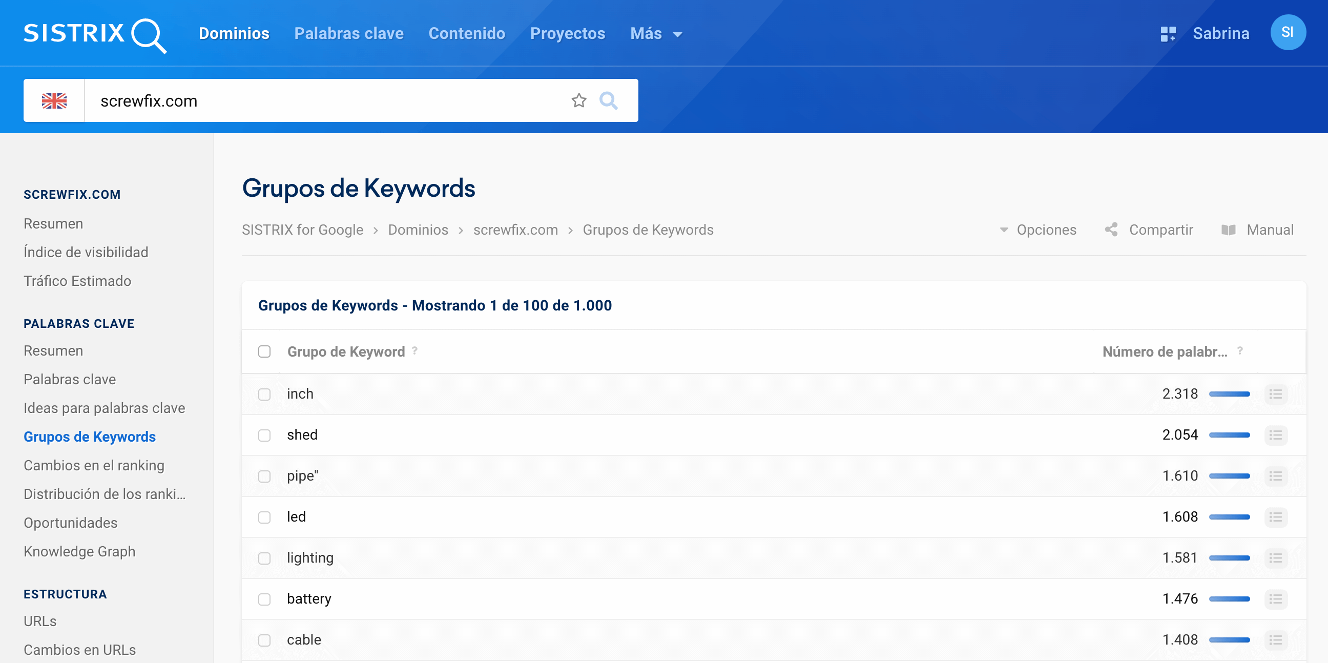 También puedes descubrir nuevas palabras clave con la función de «Grupos de Keywords» de SISTRIX. Puedes identificar temas relevantes de forma rápida y fácil en tu propio sitio web o en el de tus competidores y localizar las principales palabras clave.