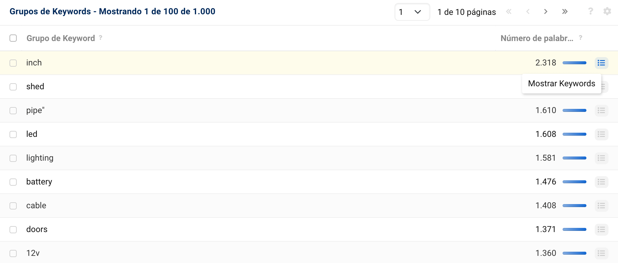 La tabla muestra el nombre del grupo de palabras clave correspondiente, es decir, la palabra de la consulta de búsqueda que todas las consultas de búsqueda tienen en común (la misma raíz). A la derecha se muestra el número de palabras clave que contiene cada grupo.