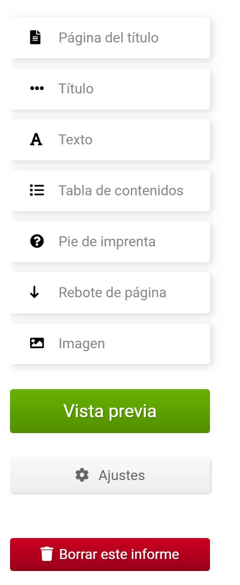Cambiar el título también es muy sencillo: solo tienes que hacer clic en él y escribir el nombre que prefieras darle. Además, gracias al menú de la izquierda, podrás personalizar aún más tu informe. A continuación, te explicamos la funciones de este menú: