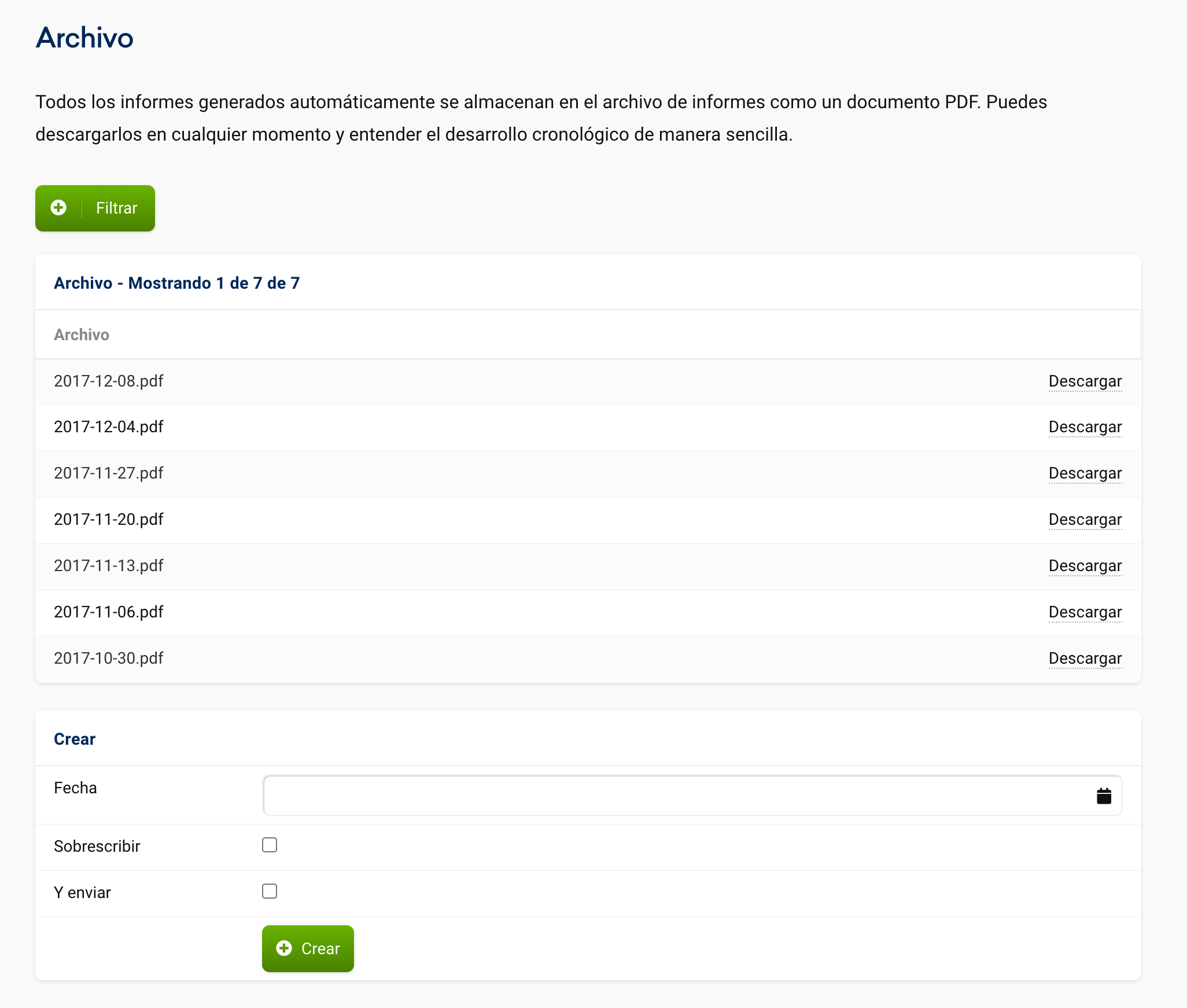 Puedes acceder al archivo en cualquier momento y ver los informes del pasado siempre que los necesites. La frecuencia con la que se guarda un informe en el archivo depende de la configuración del informe. Puedes crear informes diarios, semanales o incluso mensuales.