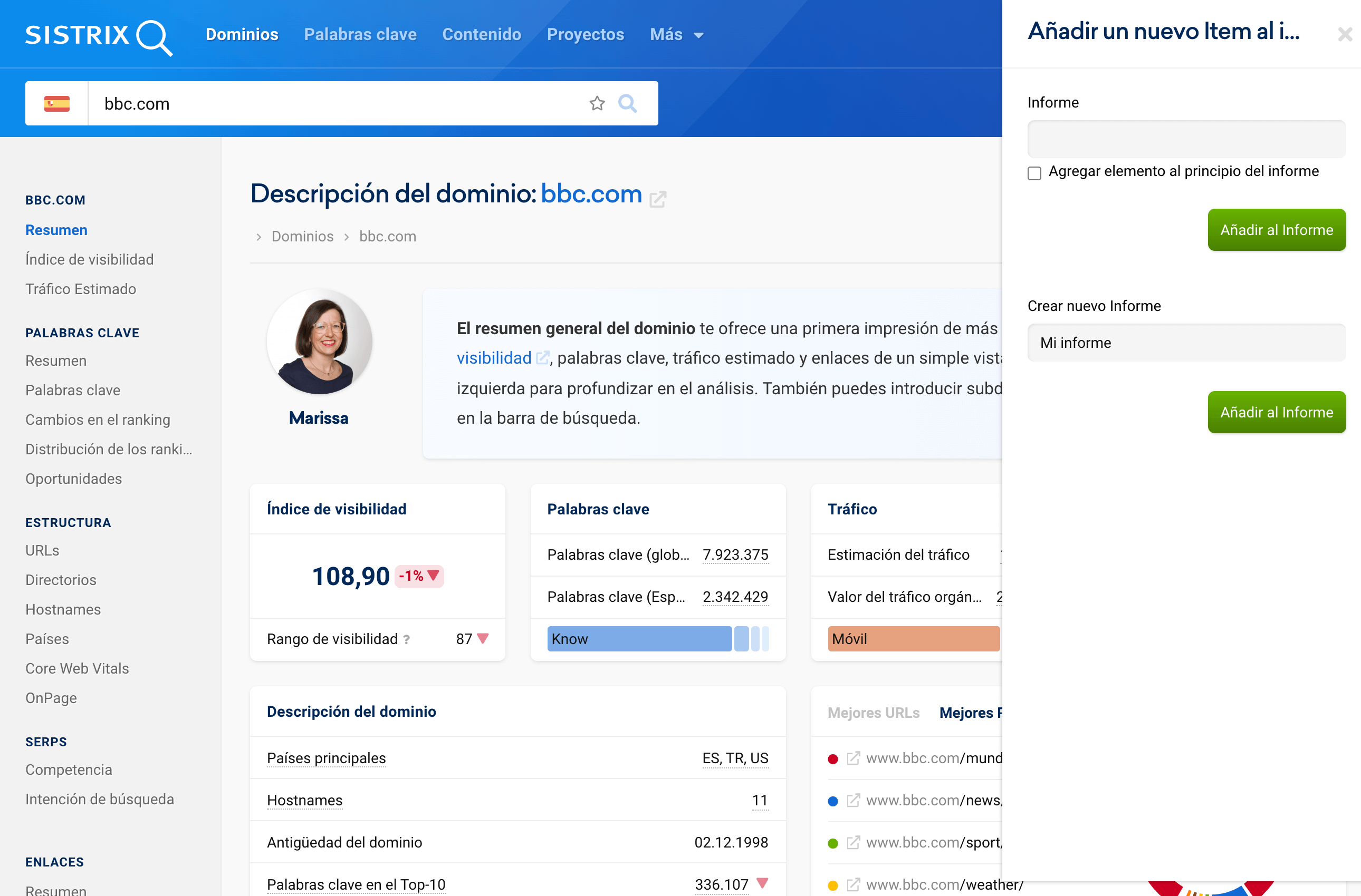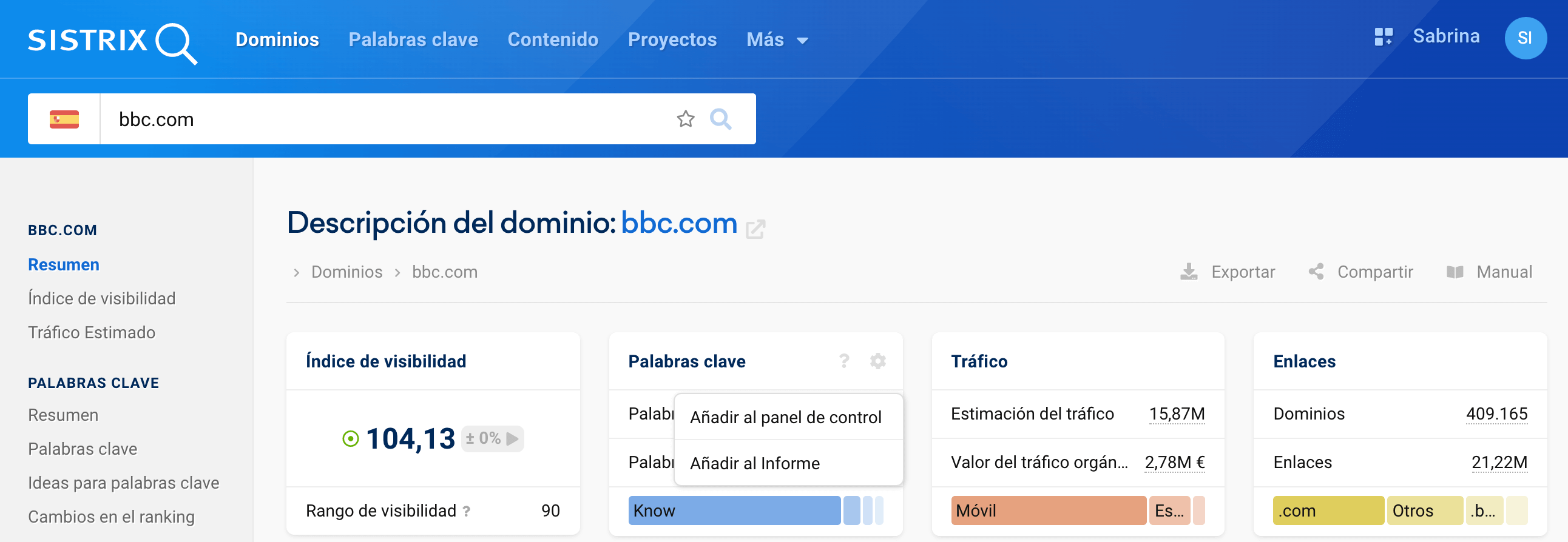 Para añadir elementos de la herramienta de SISTRIX a un informe, empieza escribiendo en la barra de búsqueda el dominio del que quieres tener los datos en el informe (1). Llegarás a la página del resumen.