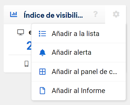 Haciendo clic en la rueda dentada aparecerán todas las opciones disponibles para ese recuadro. Esto incluye, por ejemplo, las opciones para añadir los datos a un panel de control o informe.