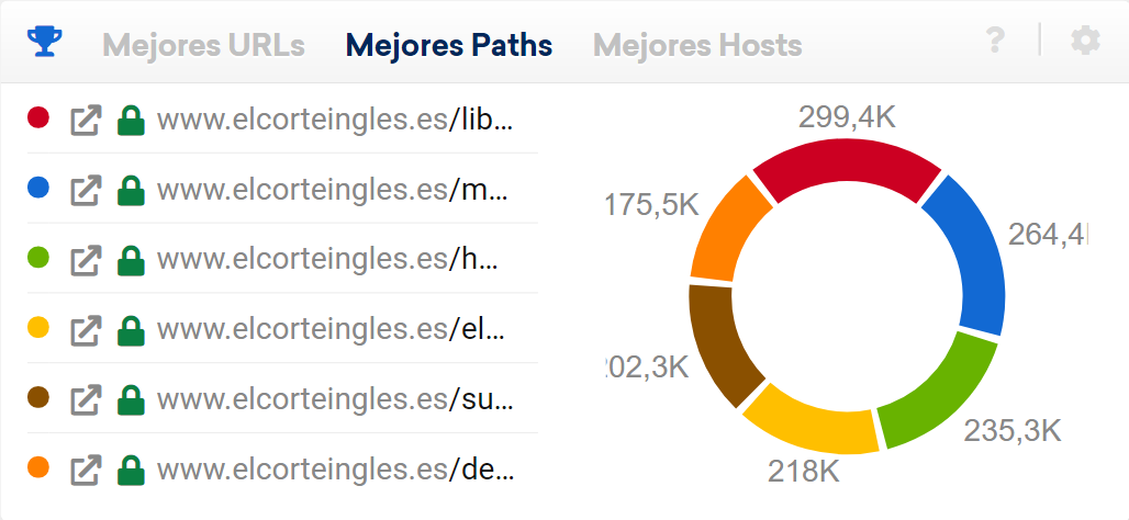 Este gráfico circular te muestra los directorios, subdominios y URLs más exitosos, basándose en el número de palabras clave posicionadas orgánicamente. Si haces clic en un path, host o URL la herramienta te llevará a su propia página resumen, mientras que el icono abrirá la URL correspondiente en una pestaña nueva.