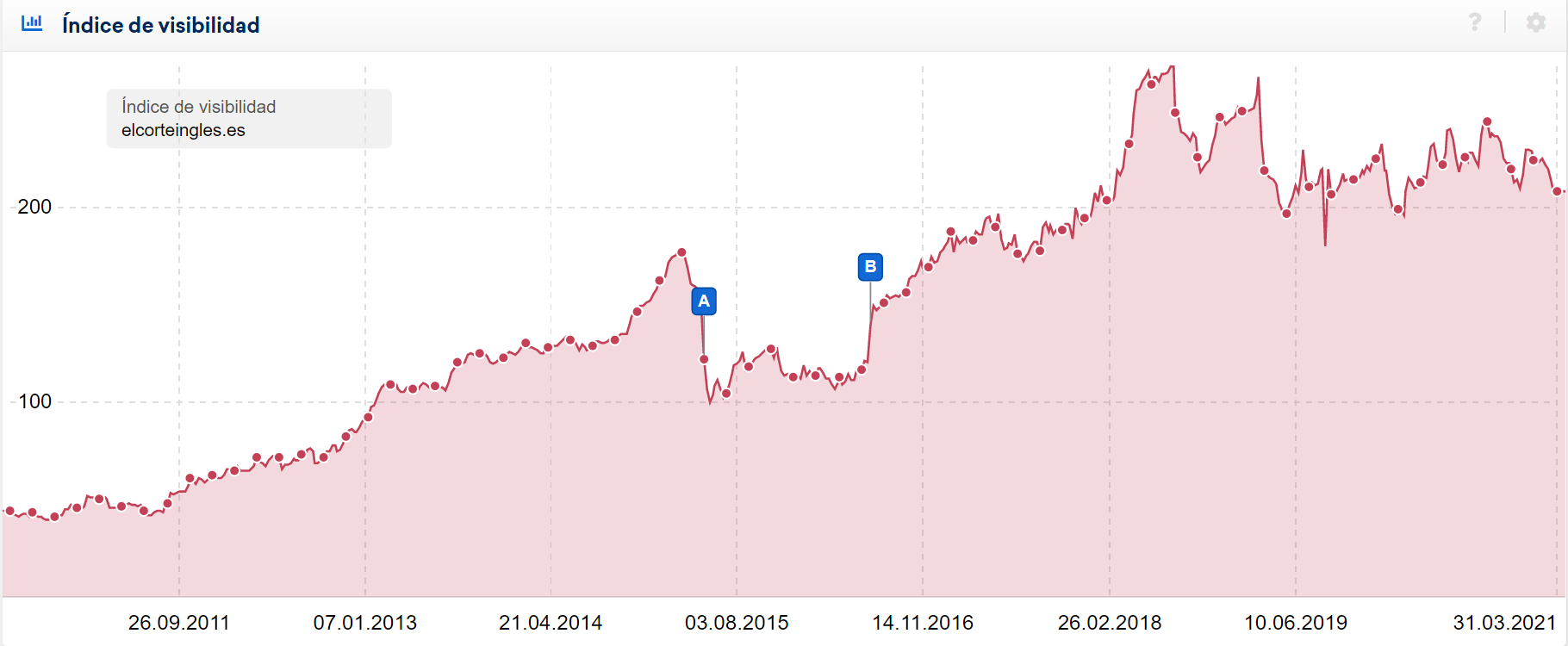 El pin azul del gráfico representa una actualización de Google que podría haber afectado la visibilidad del dominio. La herramienta los muestra de manera automática si registra un cambio notable en el posicionamiento del dominio en una fecha concreta en la que Google ha confirmado haber efectuado una actualización de su algoritmo. Por favor, lee el artículo «Documentar el desarrollo con pines de eventos» para conocer más acerca de este tema.