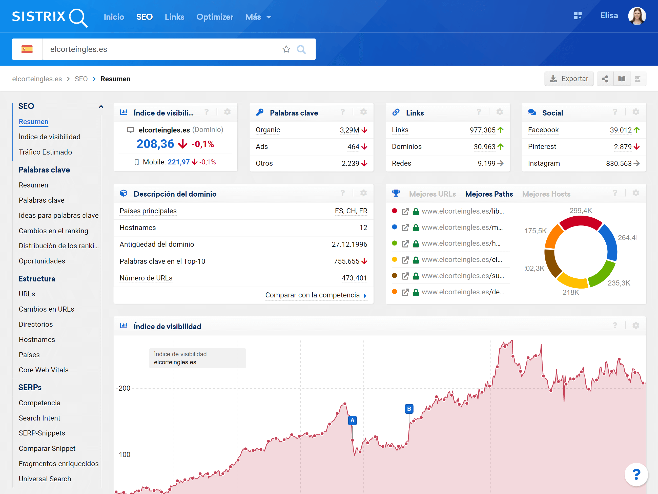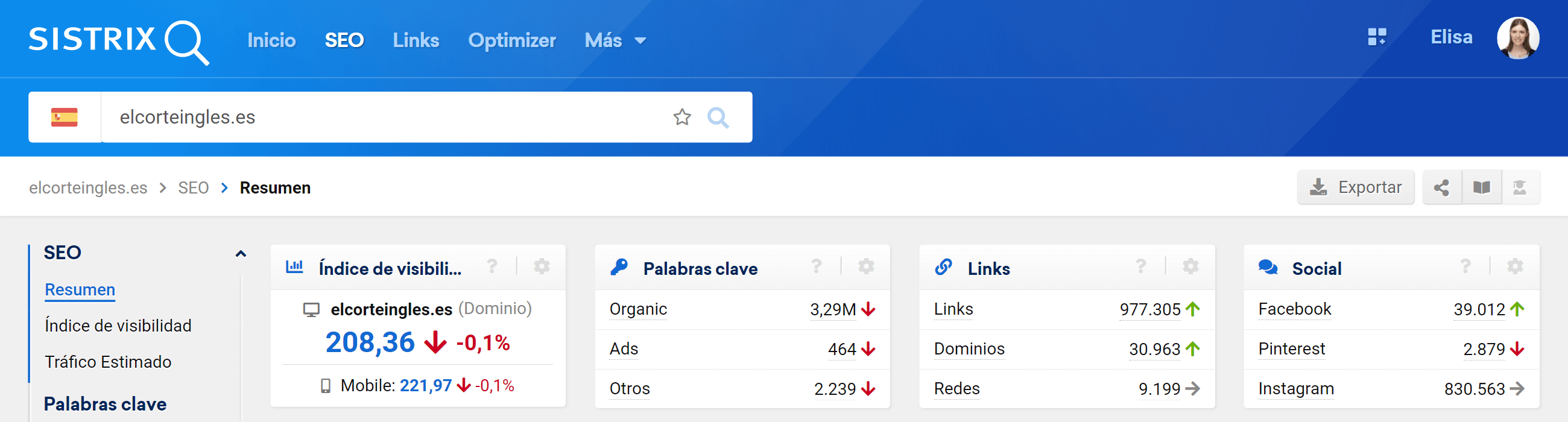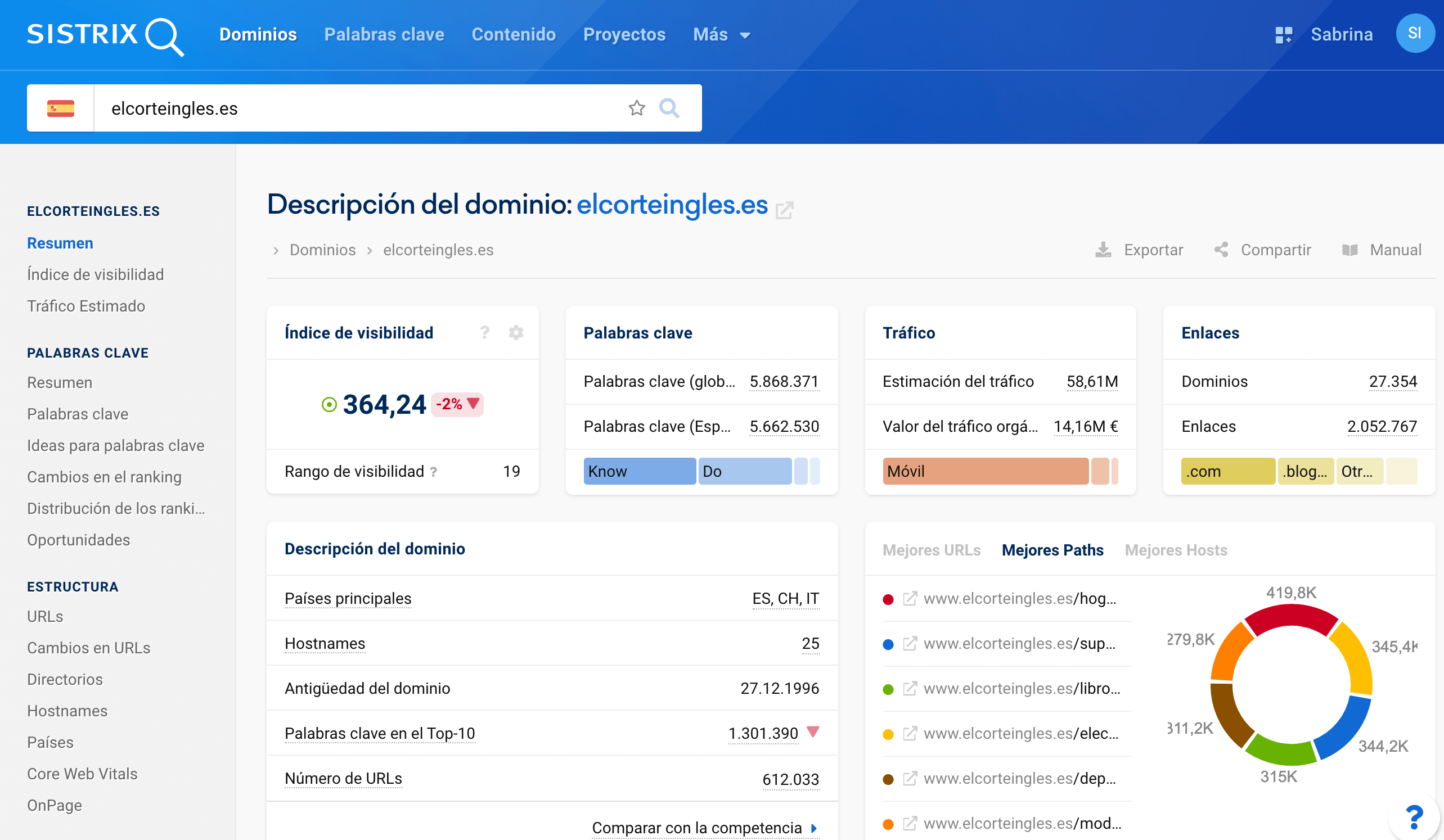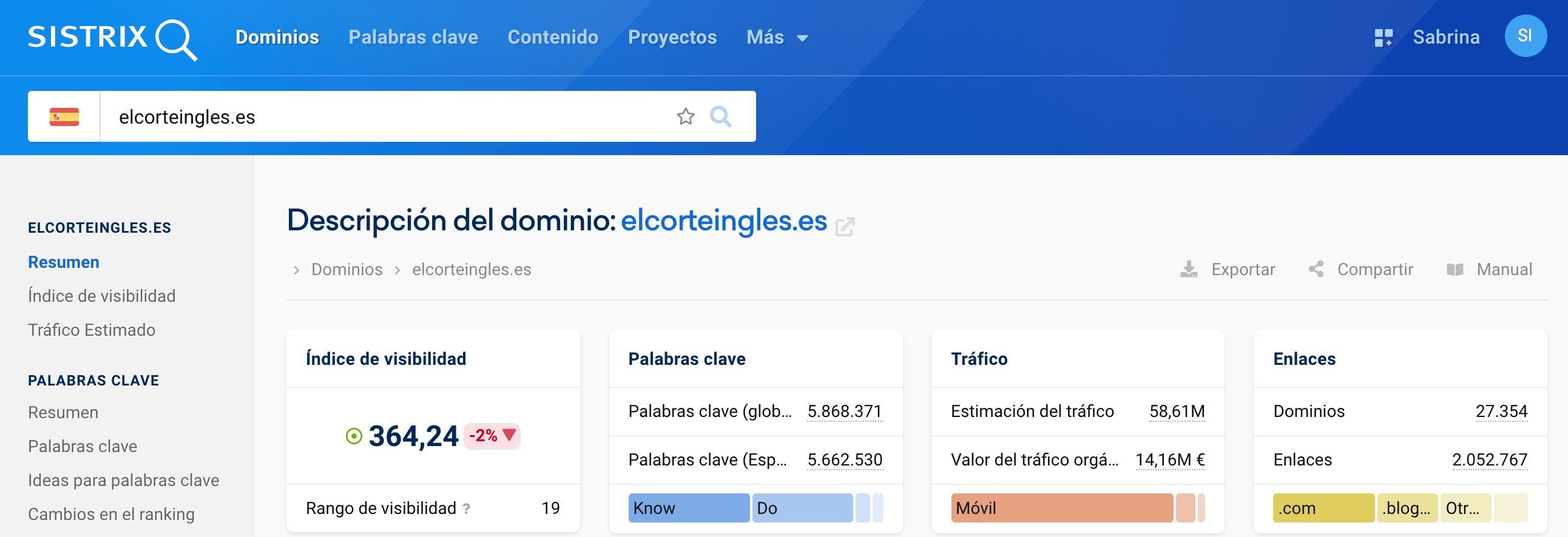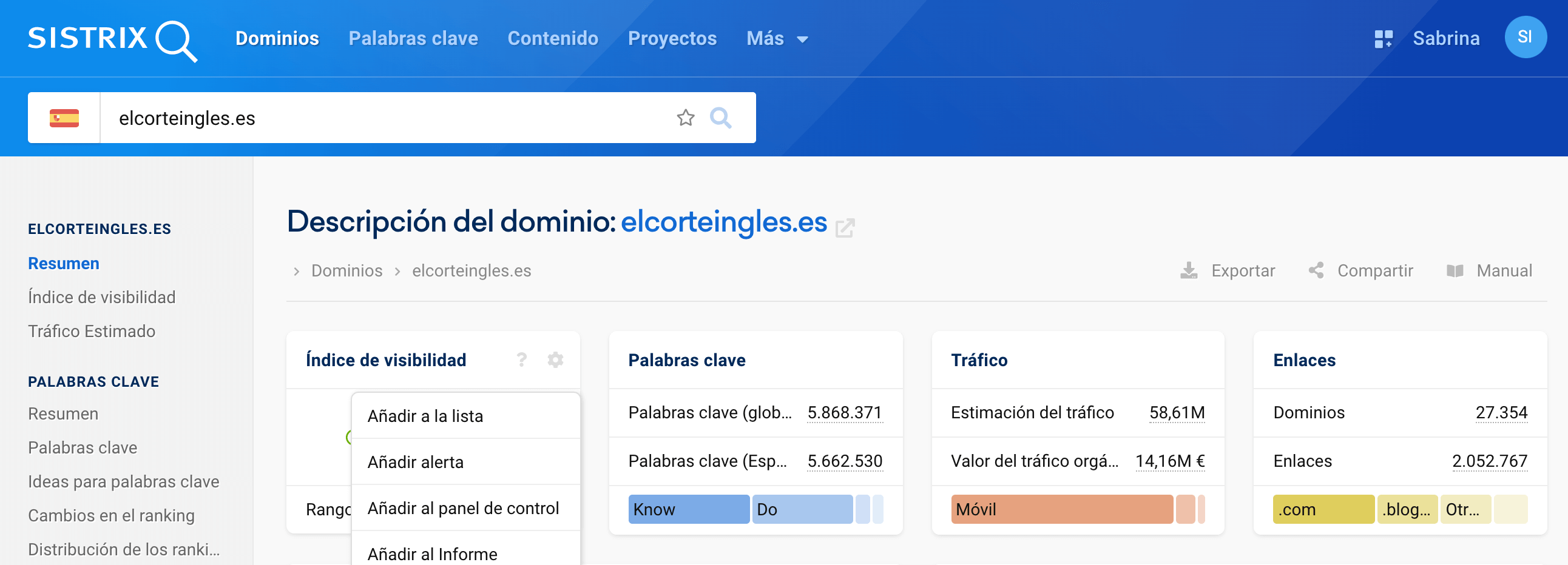 Si quieres cambiar entre las áreas de SISTRIX, por ejemplo de dominios a palabras clave, puedes hacerlo a través del menú de navegación de la parte superior.