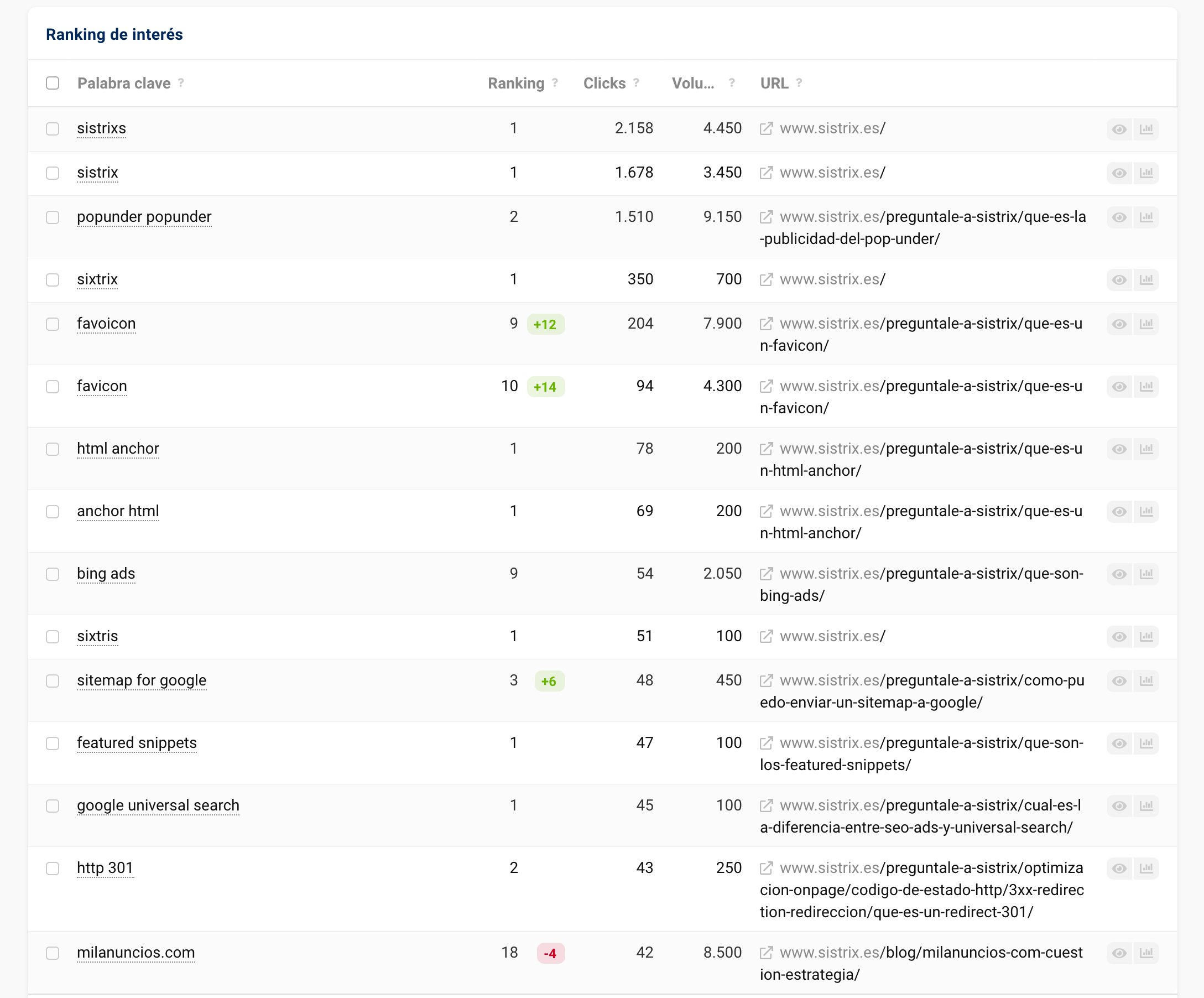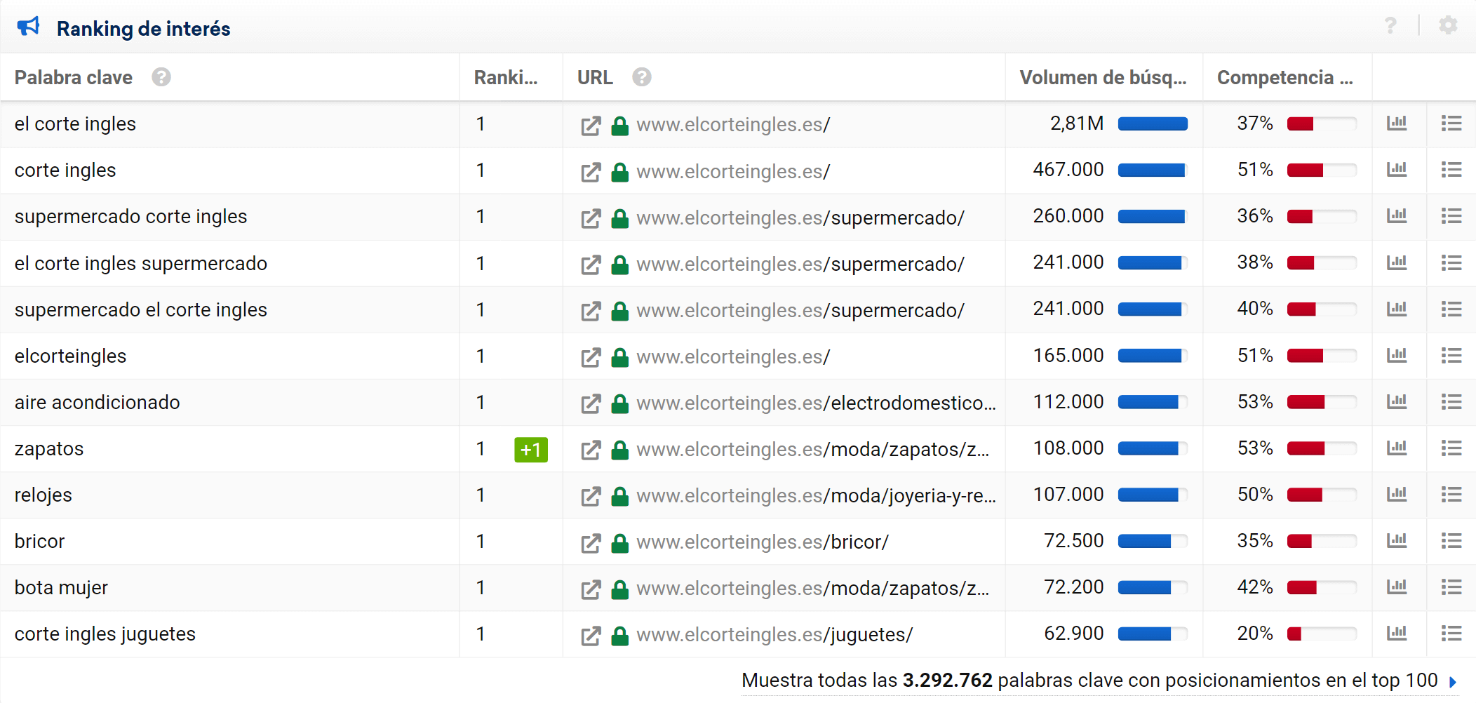 - Ranking: posición actual del dominio para una palabra clave específica, y respecto a la semana pasada, el crecimiento o decrecimiento que experimenta.