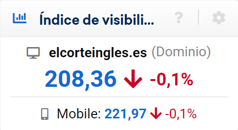 El primer recuadro arriba a la izquierda te muestra el valor del índice de visibilidad diario para dispositivo móvil, y el porcentaje de diferencia con el día anterior. Debajo, puedes ver el rango de visibilidad del dominio en comparación con otros dominios.