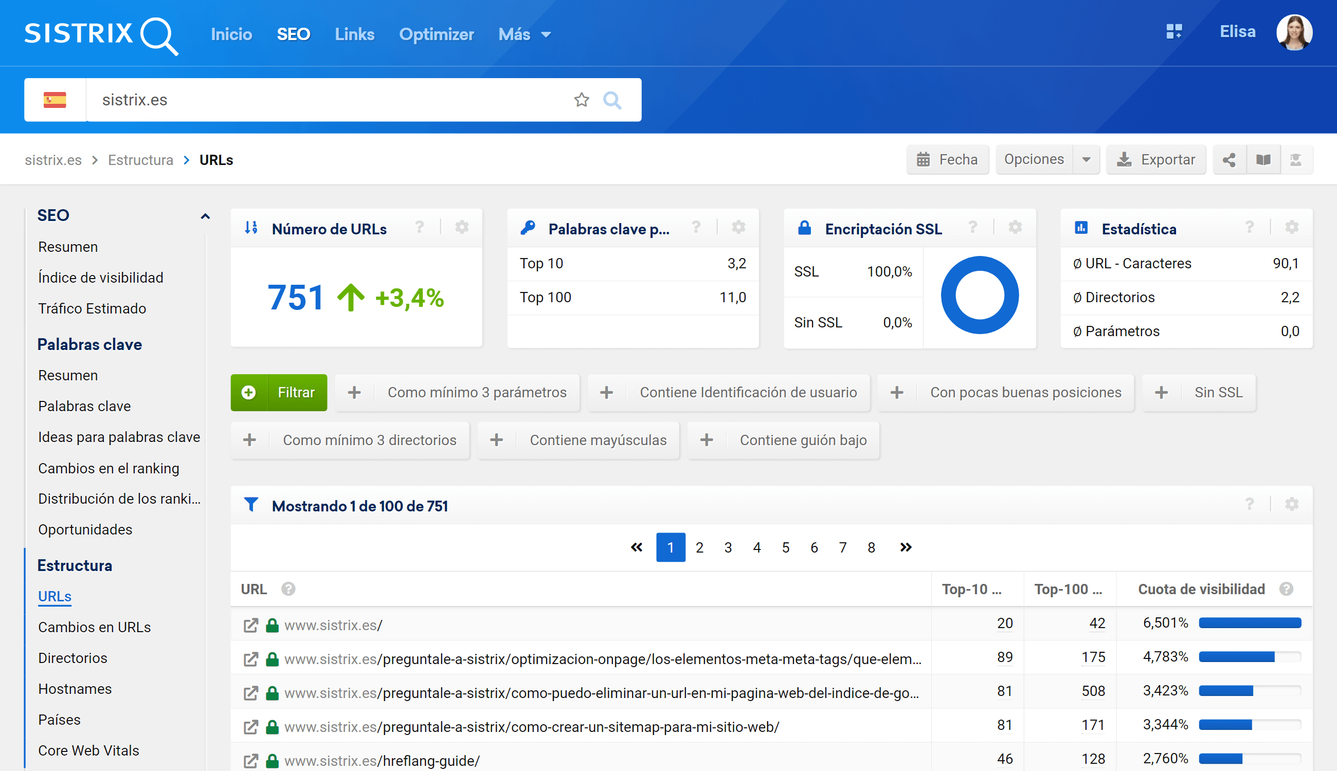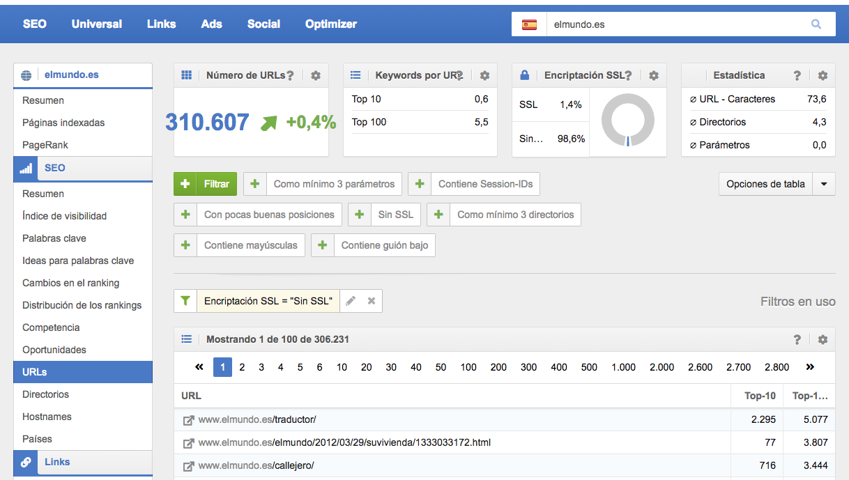Podemos comprobarlo introduciendo nuevamente el dominio en la barra de búsqueda de SISTRIX y seleccionando a continuación el elemento «URLs» en el menú de la izquierda. Al hacer clic en el filtro predeterminado «Sin SSL», conseguiremos una lista con todas las URLs del dominio para las que Google aún no muestra la versión HTTPS en los resultados de búsqueda.