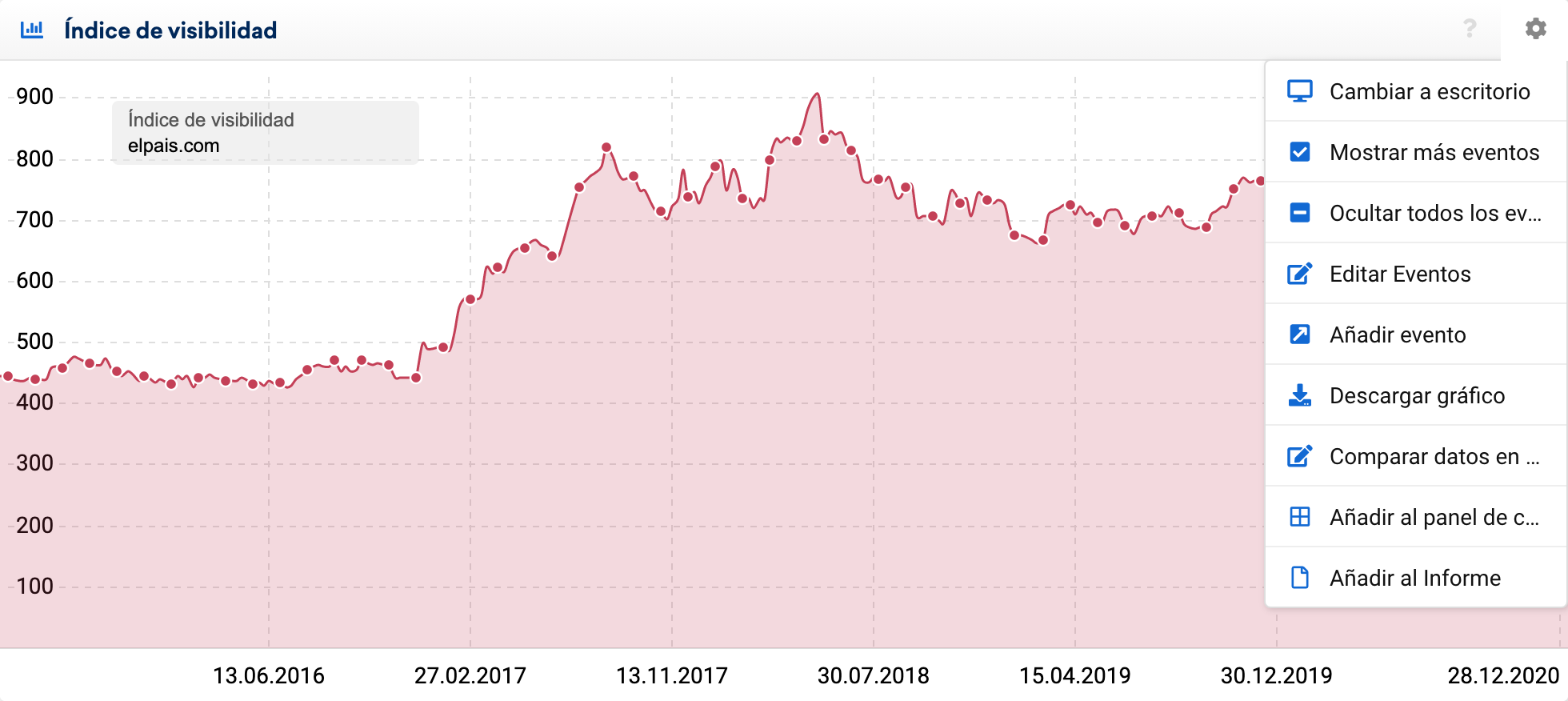 También nos gustaría observar la tendencia del Índice de Visibilidad con los datos para dispositivos de escritorio. Por lo tanto, seguiremos el mismo procedimiento, pero esta vez con la base de datos para dispositivos de escritorio. Abrimos nuevamente el gráfico con el historial del Índice de Visibilidad en el resumen general de nuestro subdominio «elpais.com», hacemos clic en la rueda dentada de la esquina superior derecha y seleccionamos nuevamente «Comparar datos en el gráfico».