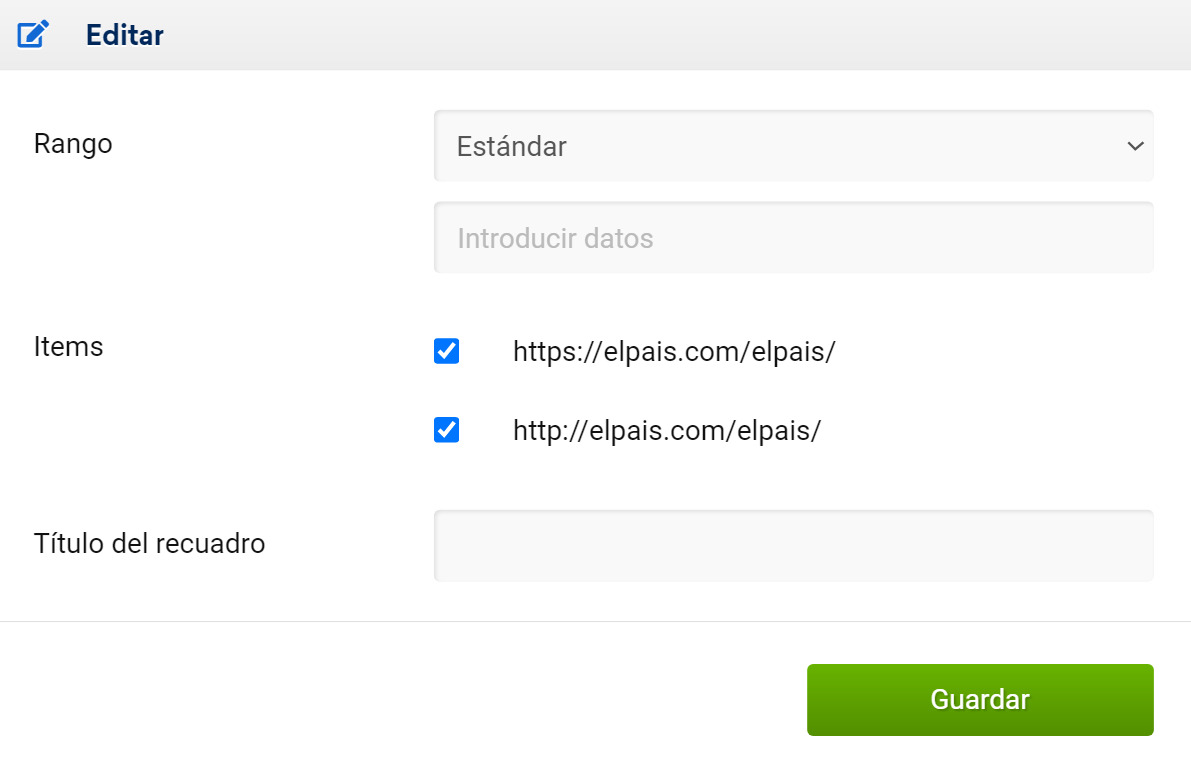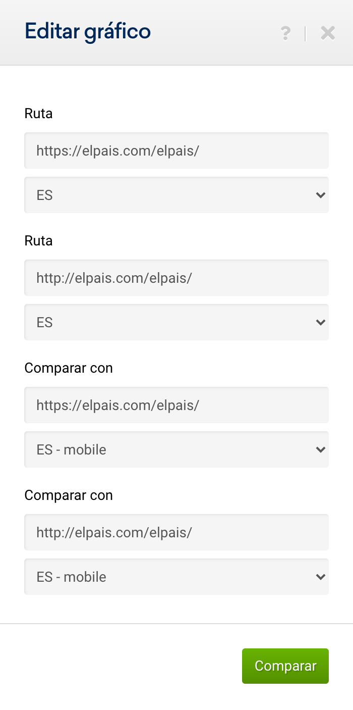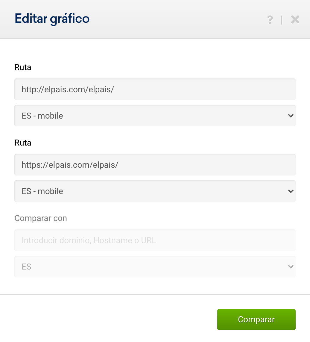 Aquí introducimos las rutas HTTP y HTTPS para el subdominio «elpais.com». Aquí es importante que la consulta comience con el protocolo (http:// o https://), seguido del resto de la URL y, sobretodo, no hay que olvidar la barra (/) al final.