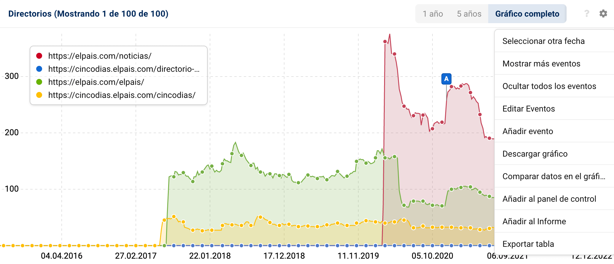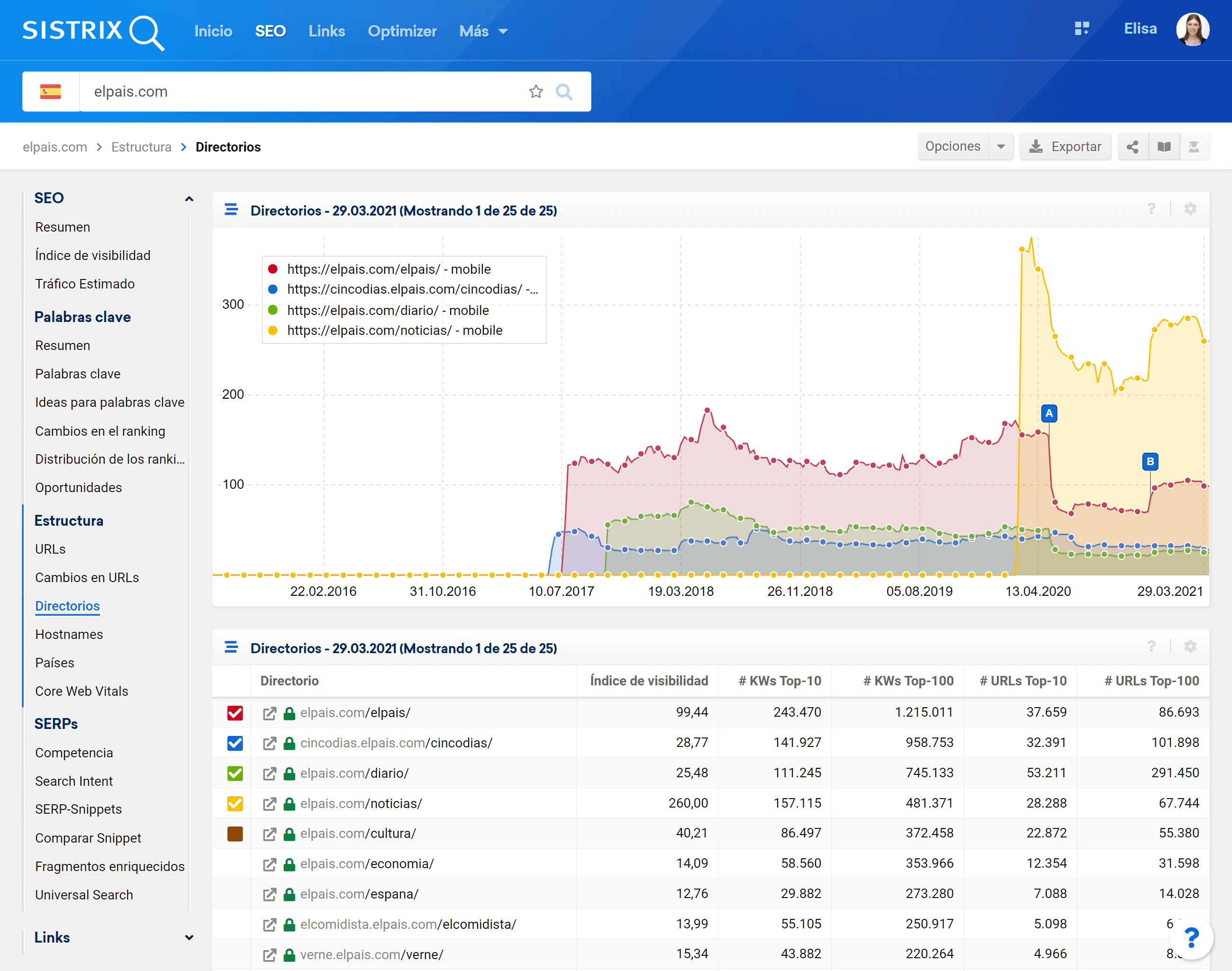 Aquí hemos decidido analizar la evolución solo de tres directorios: /noticias/, /elpais/, y /cincodias/.
