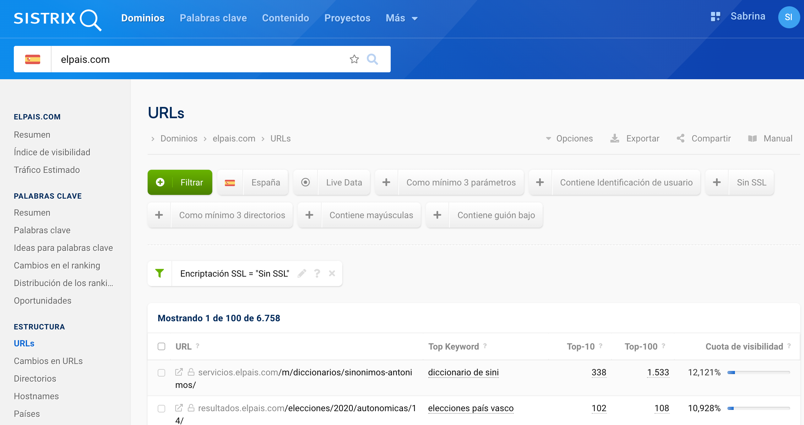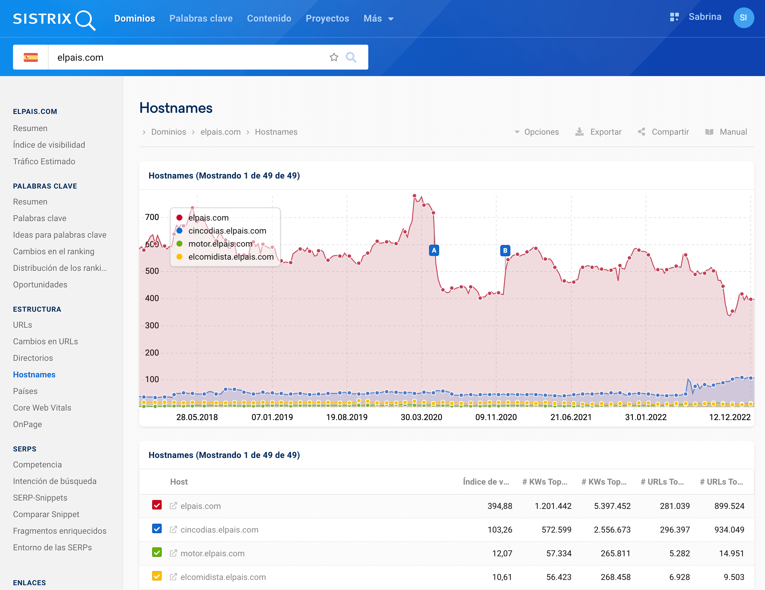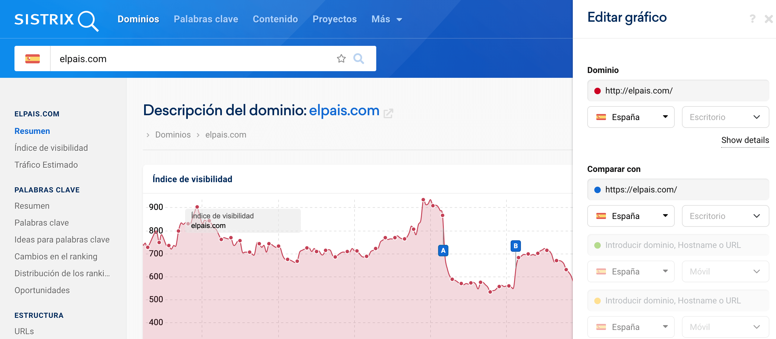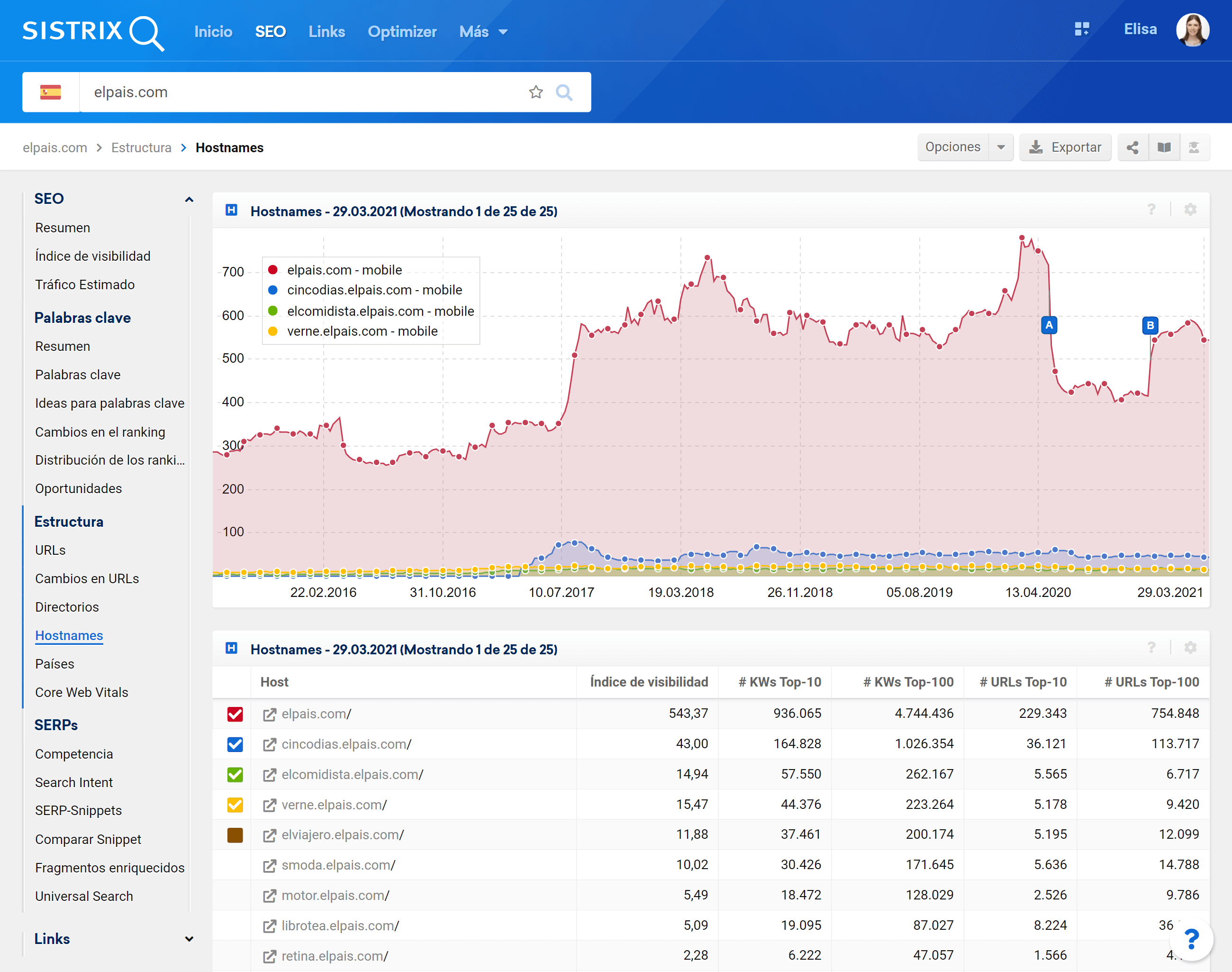 En nuestro ejemplo decidimos analizar únicamente el subdominio «elpais.com» 3.