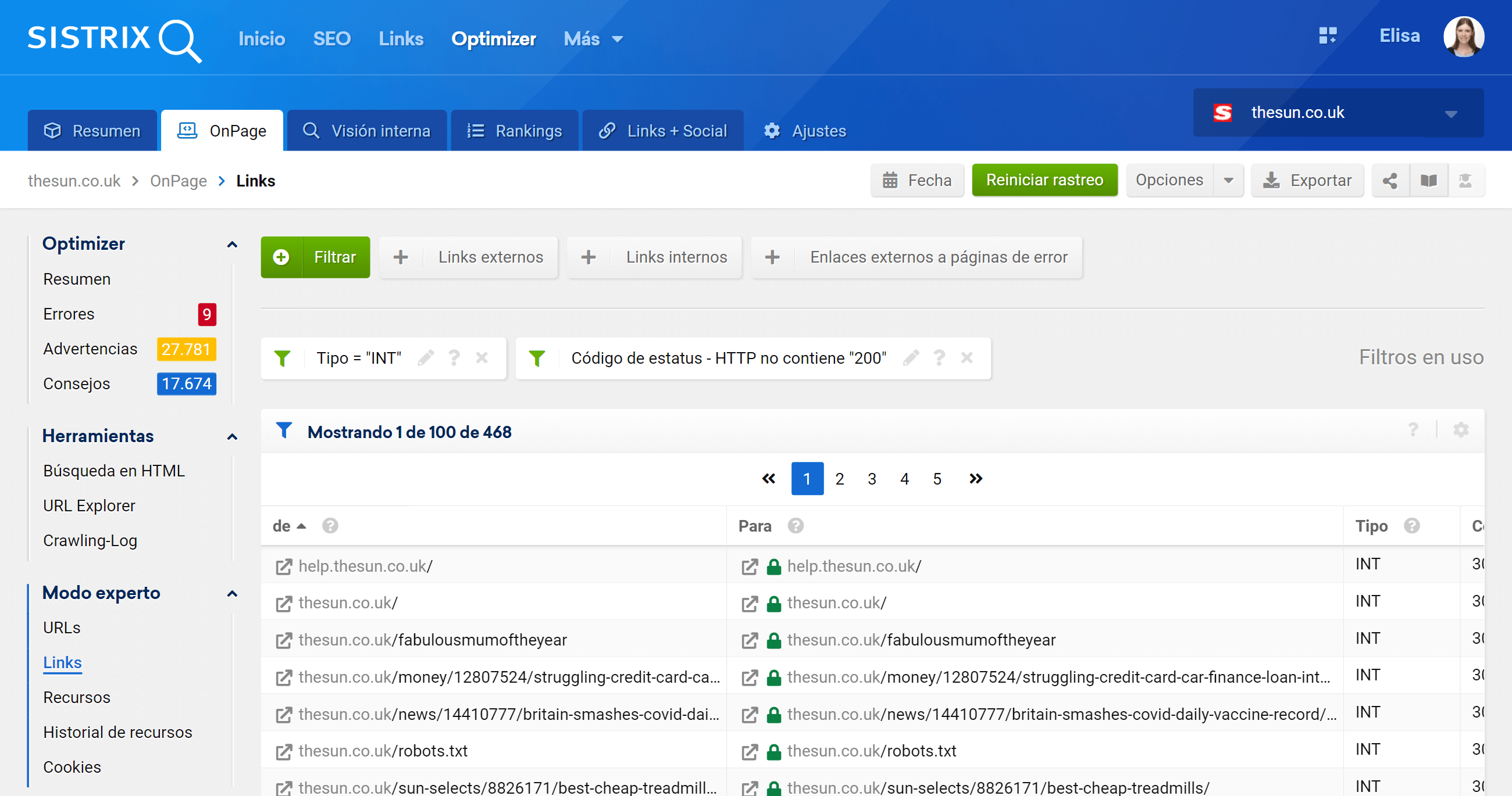 Para comprobarlo, nuevamente en la sección Onpage de tu proyecto, selecciona «Enlaces» en el menú de la izquierda de la pantalla justo debajo de «URLs» en el apartado «Modo Experto», para que aparezca una tabla con todos los enlaces externos e internos encontrados durante el rastreo. Siguiendo el mismo procedimiento que en el apartado anterior, selecciona primero «Enlaces internos» y crea el filtro Código de estado HTTP – No contiene el texto: “200”: