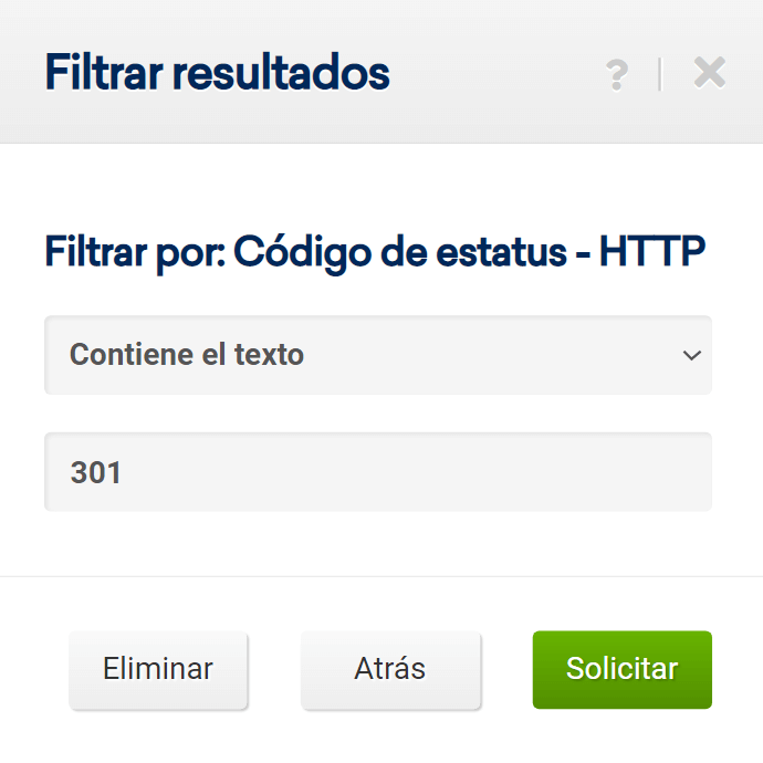 Para comprobarlo, selecciona «URLs» en el menú de la izquierda en el apartado «Modo Experto» (situado en la sección Onpage del proyecto creado para el dominio) y haz clic en el botón verde «Filtrar». Esto te permitirá establecer filtros personalizados, por ejemplo, para la URL como: contiene el texto “http://” y para el Código de estado – HTTP como: no contiene el texto “301”.