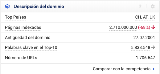 Para hacerlo, haz clic en el icono de la bandera en el lado izquierdo de la barra de búsqueda para cambiar el país analizado, y pulsa intro o haz clic en el símbolo . La herramienta te llevará directamente a la página resumen del dominio para el mercado de búsqueda seleccionado, donde podrás evaluar visibilidad, posicionamiento, enlaces, señales sociales y mucho más, en móviles o en desktop.
